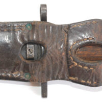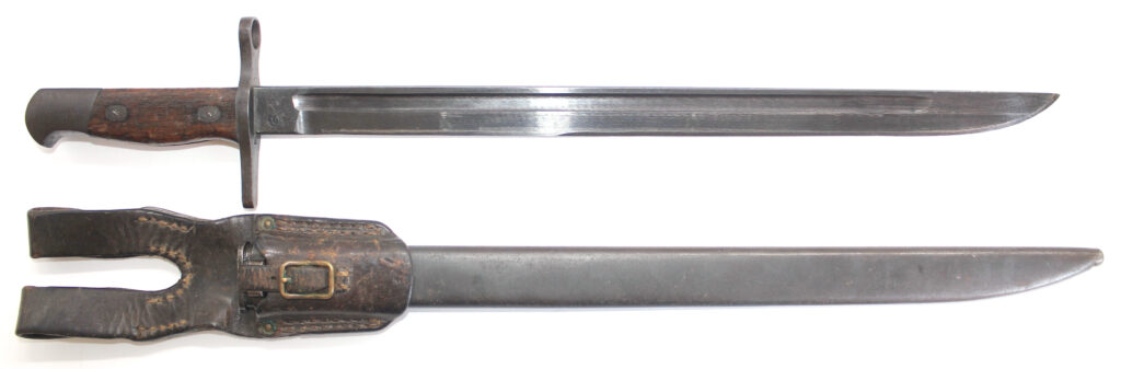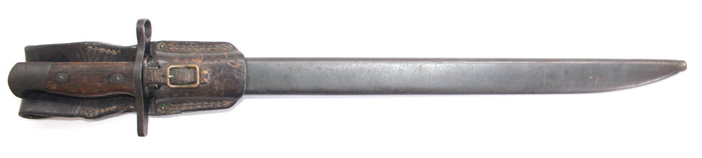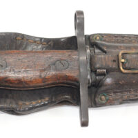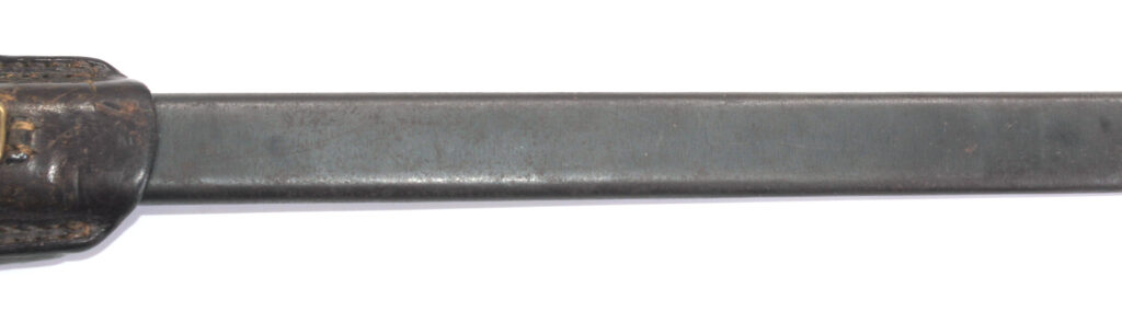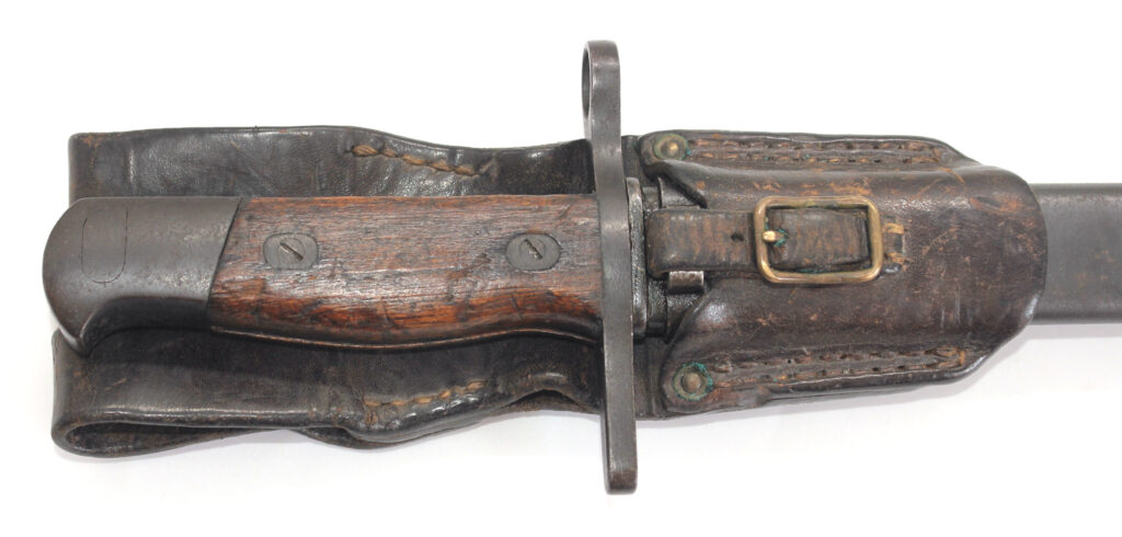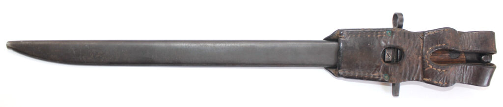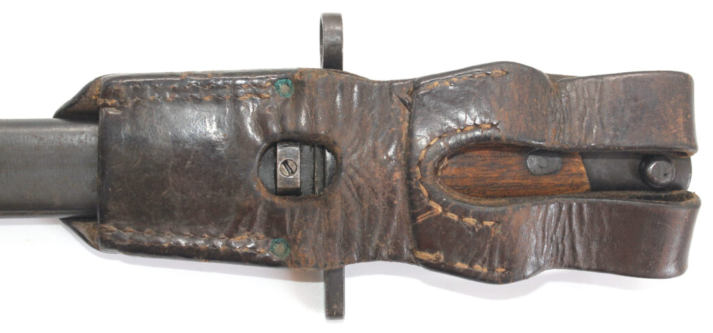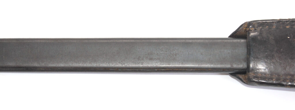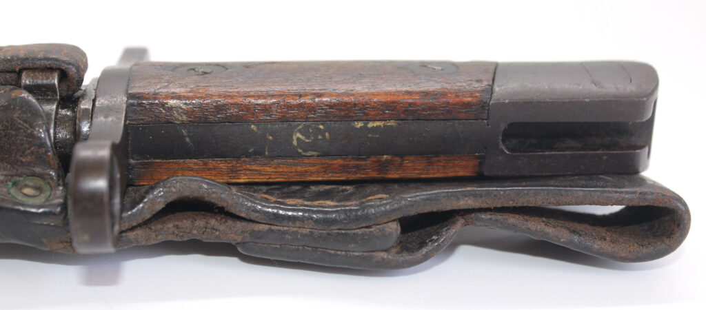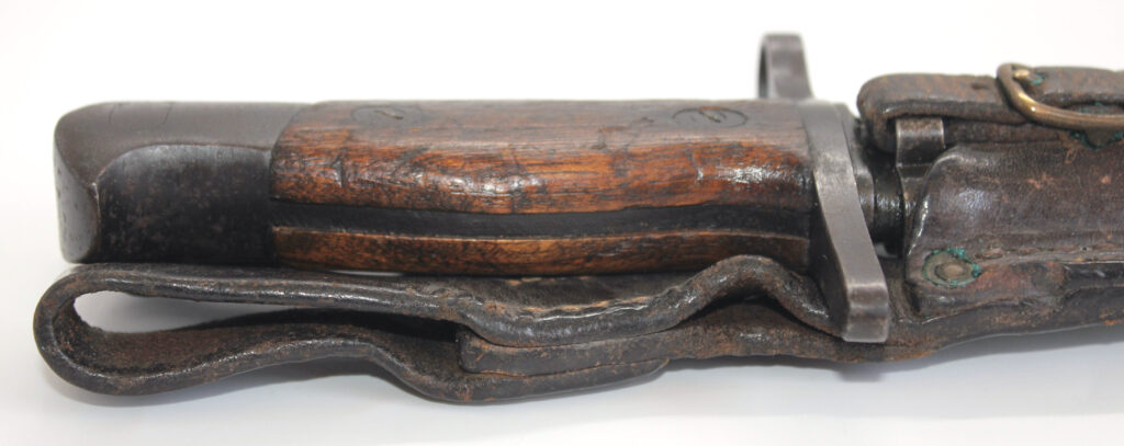 Le fourreau en acier est avec son gousset/porte baïonnette en cuir.
