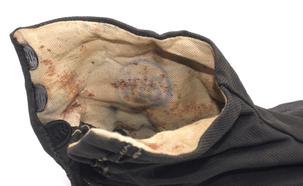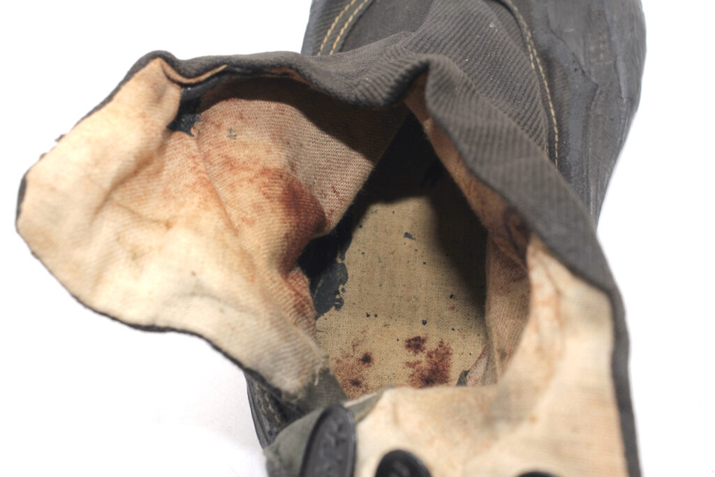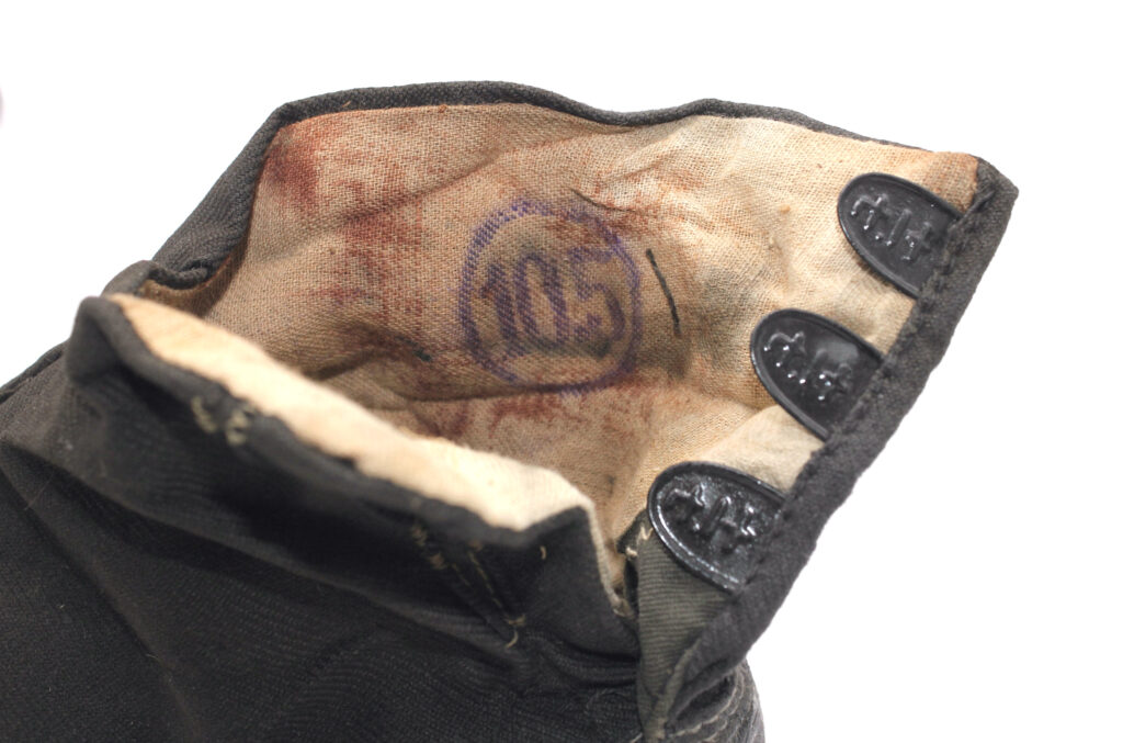 La pointure de la chaussure est présente sur les languettes : 十一.七  (Taille 11.7), cette pointure correspond à une taille 43 1/2 européenne. Un tampon indiquant la pointure est également présent à l’intérieur  mais une des chaussures comporte un tampon erroné indiquant une taille de 10.5. Des traces de sang semble également présentes à l’intérieur des chaussures.