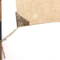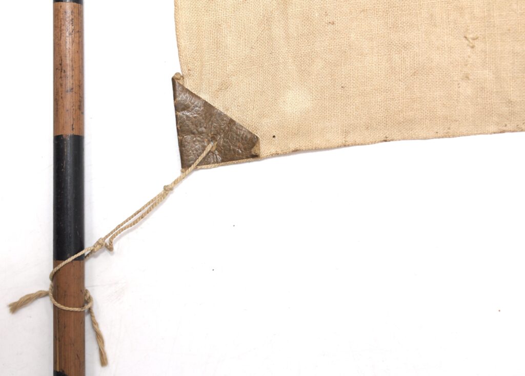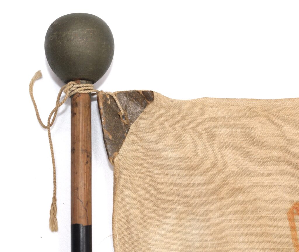 Ce drapeau en coton date des années 30/40. Il est accroché (à l’envers) sur un mât en bois.