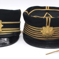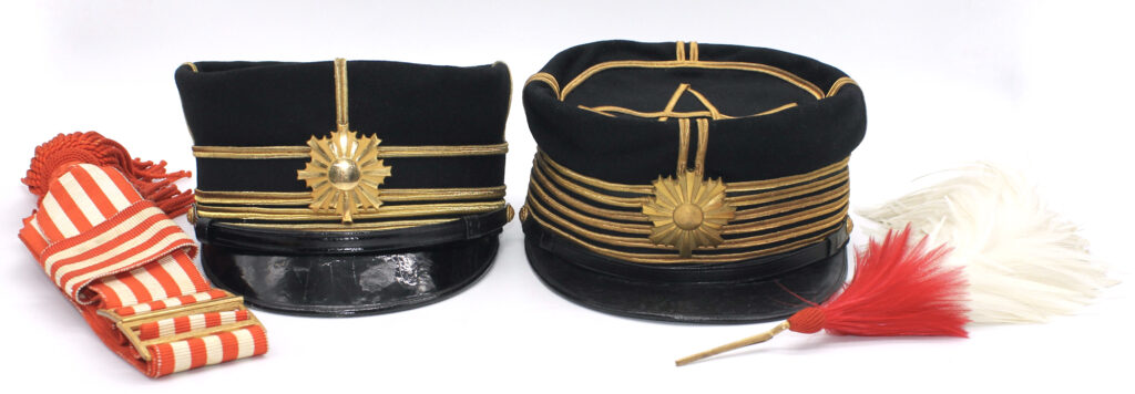 Cet ensemble comprend deux casquettes ayant appartenu au même officier qui a remplacé sa première casquette durant sa carrière suite a sa montée en grade. Son nom est brodé à l’intérieur des casquettes : 日志の / Hoshino