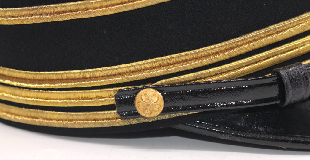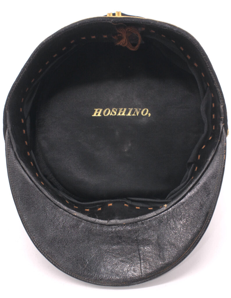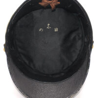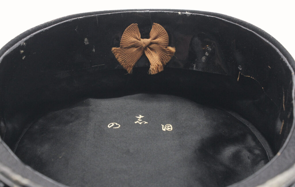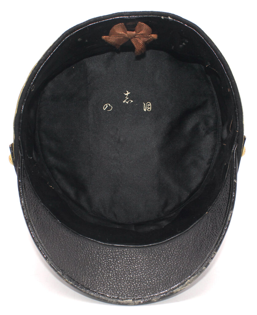 Sur la première casquette, le nom de l’officier est inscrit à l’intérieur avec des kanjis. Le tressage doré indique le grade de capitaine.