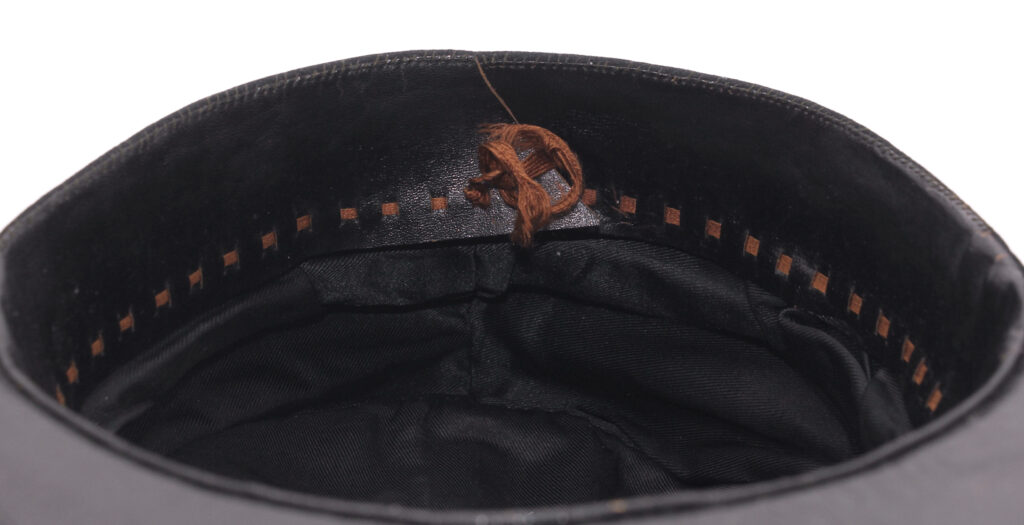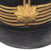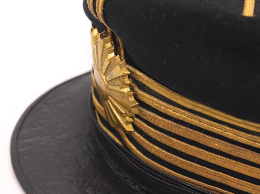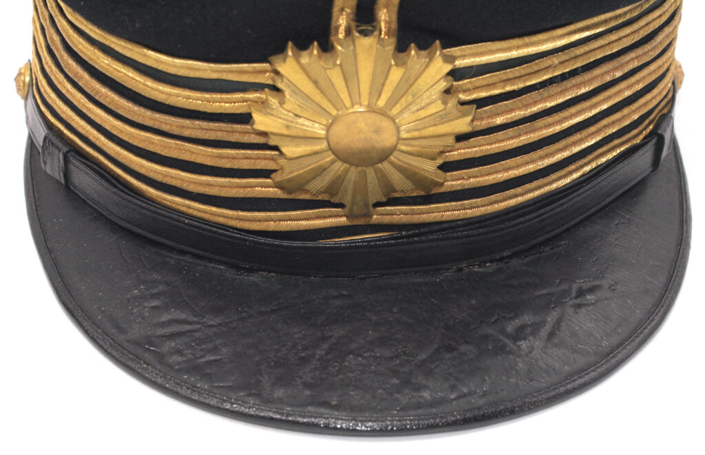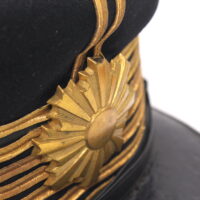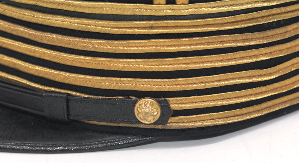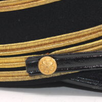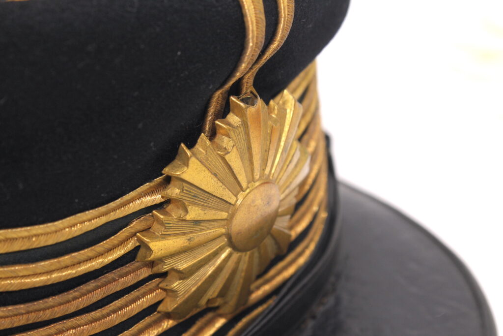 Sur la première casquette, le nom de l’officier est inscrit à l’intérieur avec des kanjis. Le tressage doré indique le grade de capitaine.