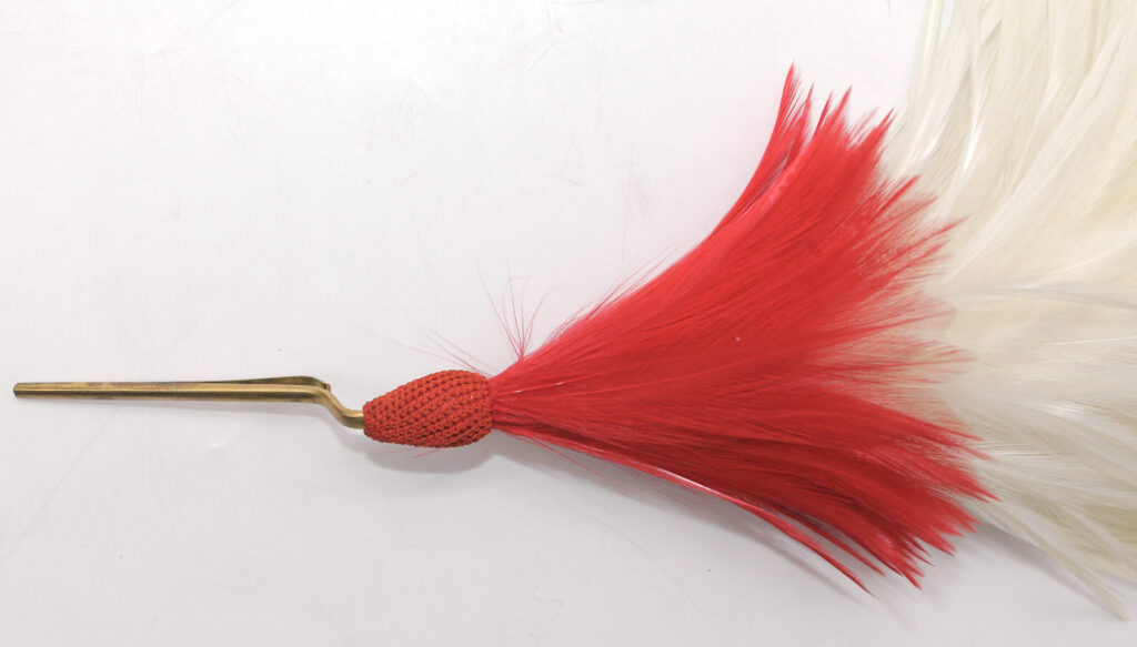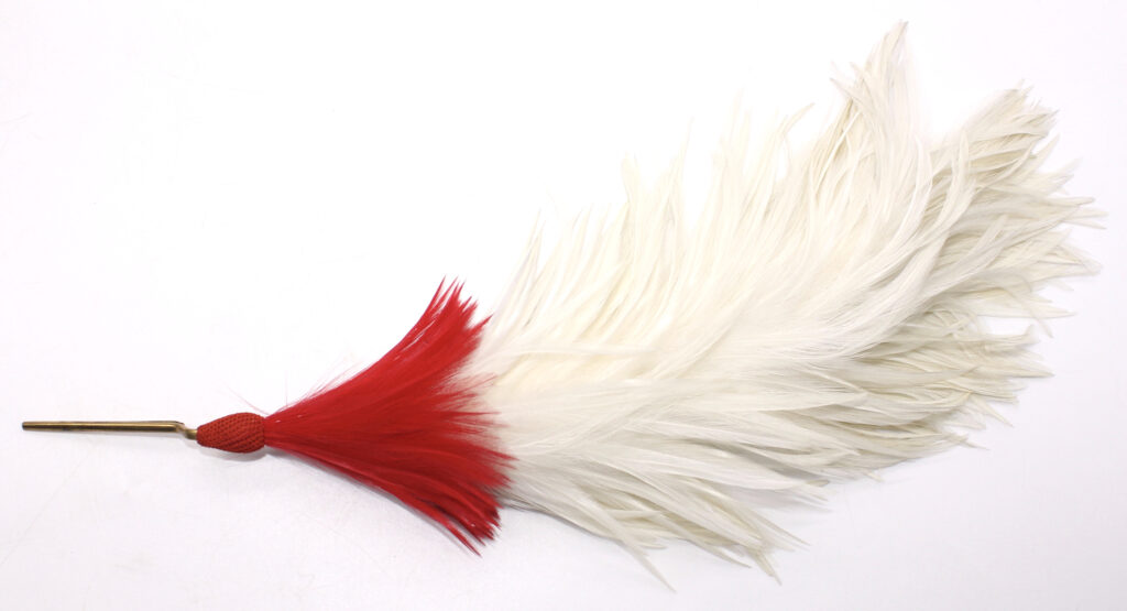 Le plumet s’insère au sommet de la pièce frontale de la casquette. Sa longueur est d’environ 40 cm.
