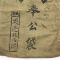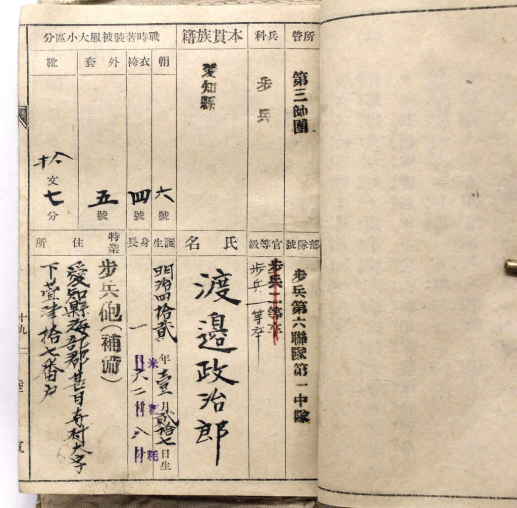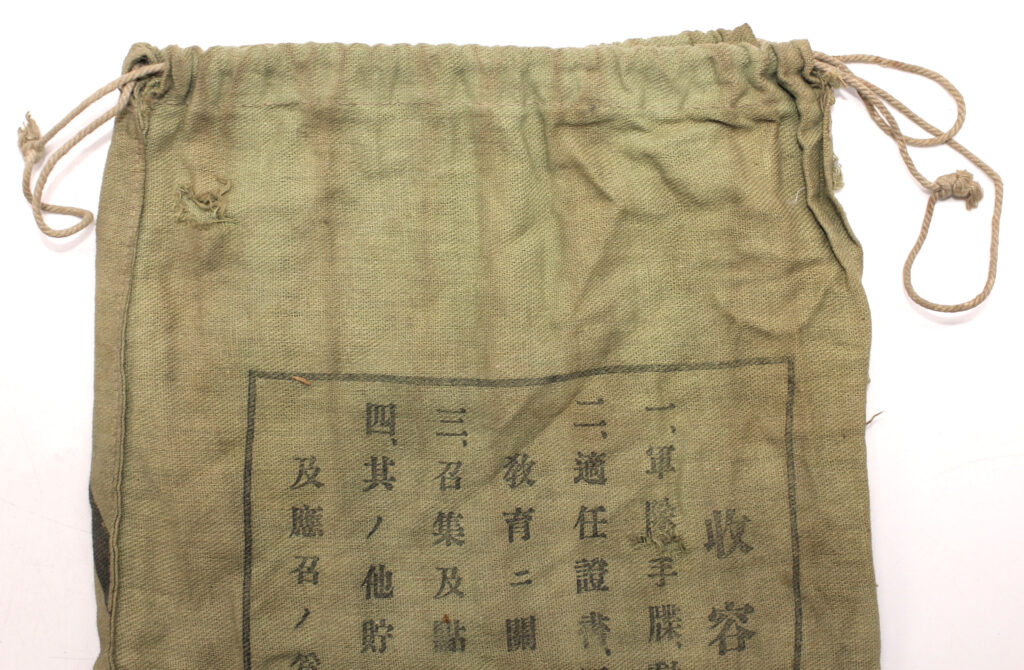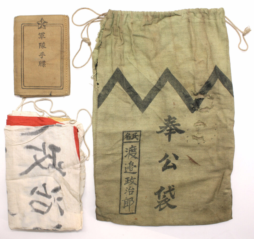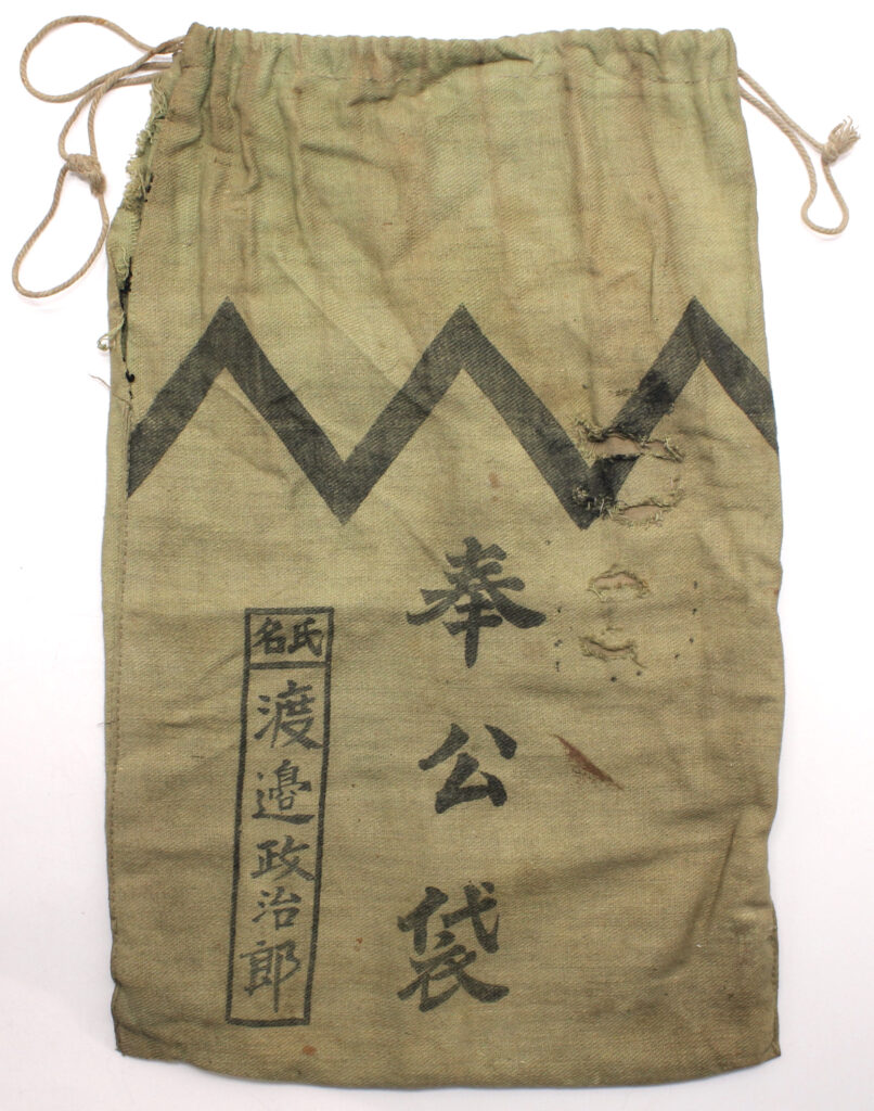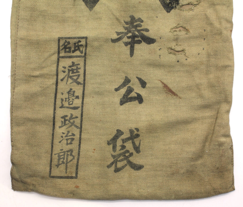 Le nom du soldat est également inscrit sur le sac et sur le livret : 渡邊政治郎 (Watanabe Masajirō).