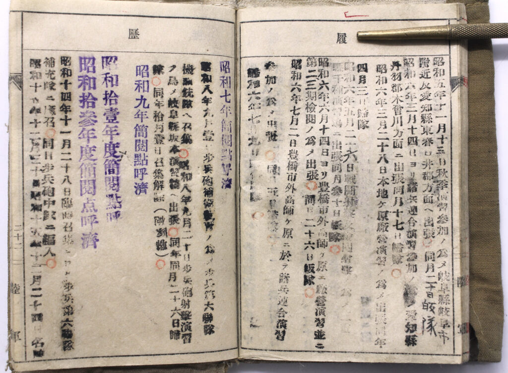 Son historique de campagne militaire est difficilement lisible. Les inscriptions violettes indiquent ses années de service dans la réserve (1932, 1934, 1936, et 1938).