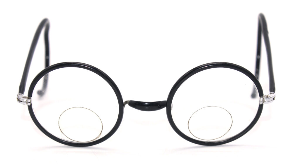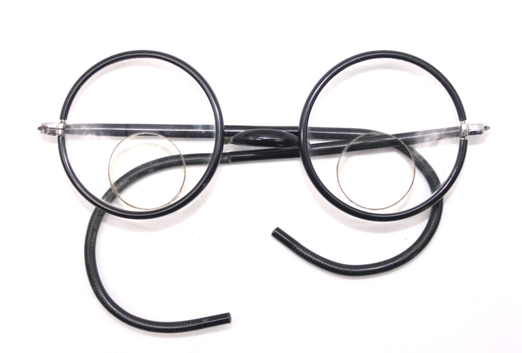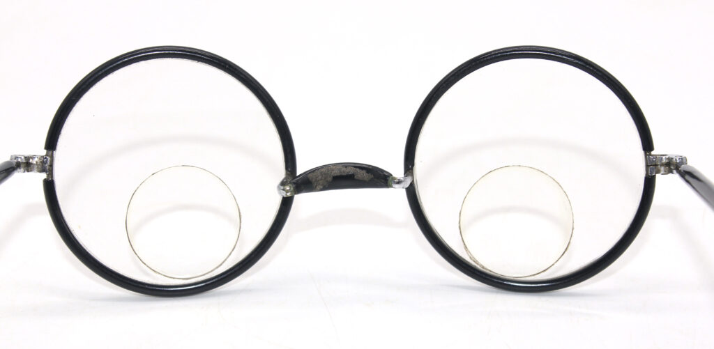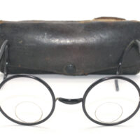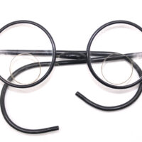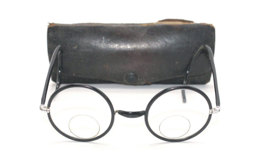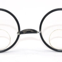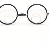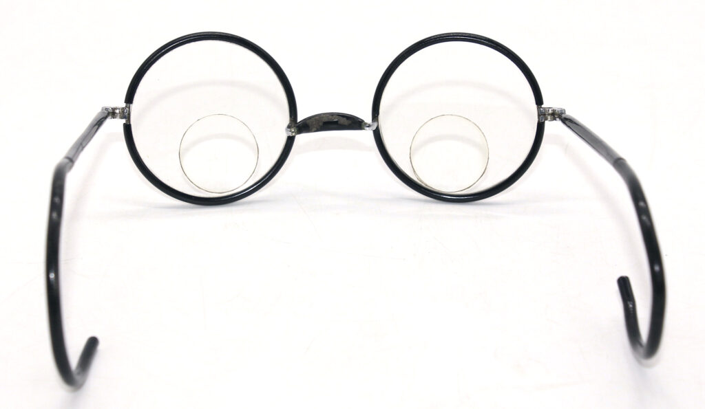 Cette paire est typique des conceptions des années 30/40, elle comporte encore ses verres à double foyer en très bon état. Les branches sont conçues pour se placer derrière les oreilles.