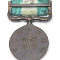 L’avant de la médaille présente des drapeaux croisés de l’armée et de la marine ainsi que le chrysanthème impérial. Au revers il est inscrit «Médaille de guerre Meiji 27-28 (1894-1895)».