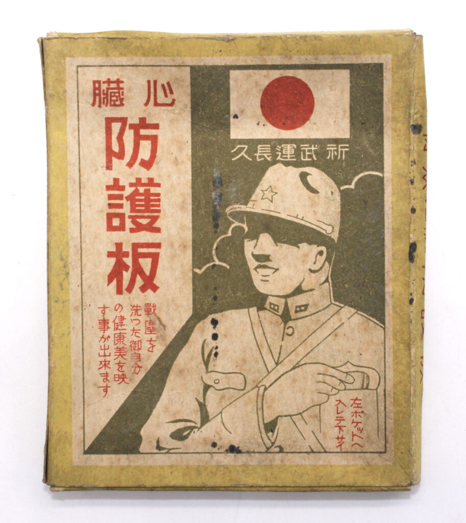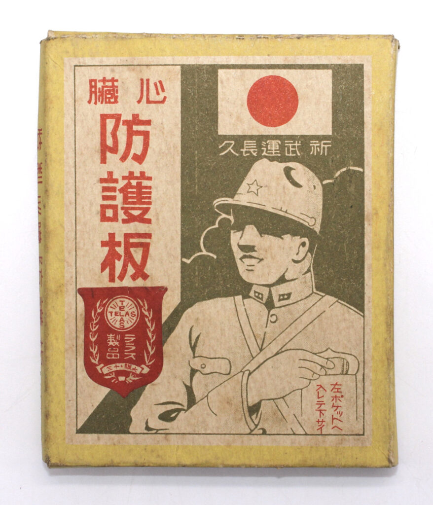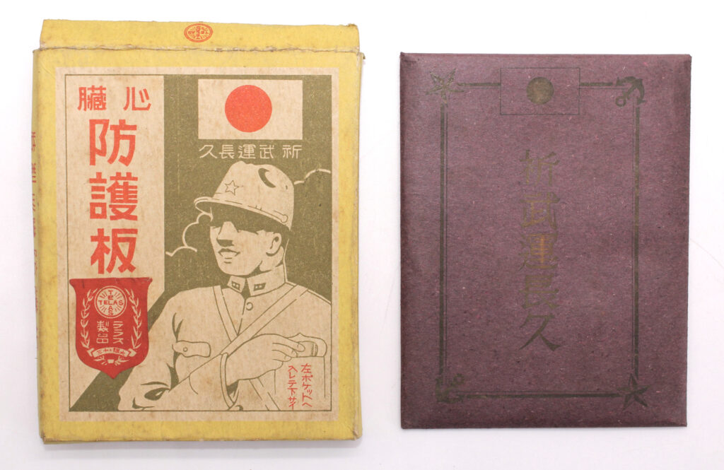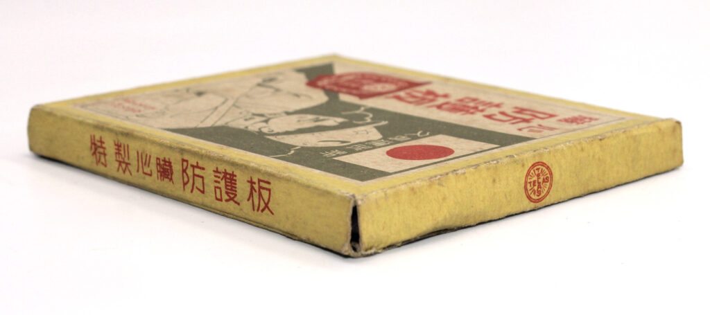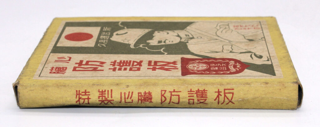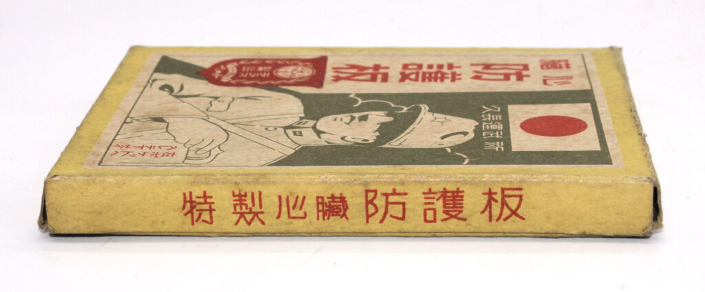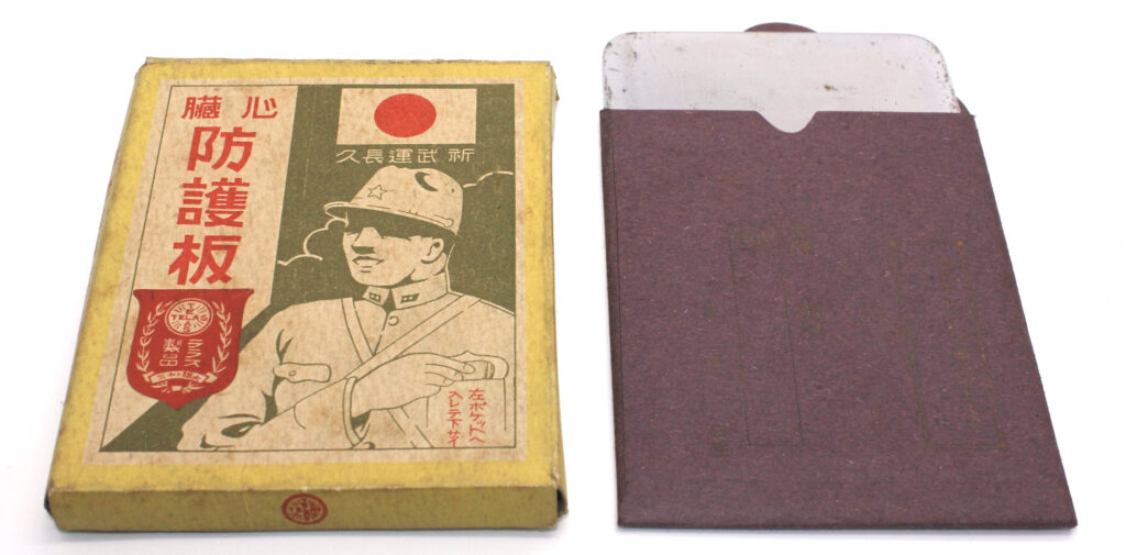 L’étui en carton contient une plaque en acier qui est glissée dans une pochette en papier. Le soldat japonais devait placer la plaque dans la poche avant gauche de sa vareuse afin de protéger son coeur d’une éventuelle balle tirée par l’ennemi.