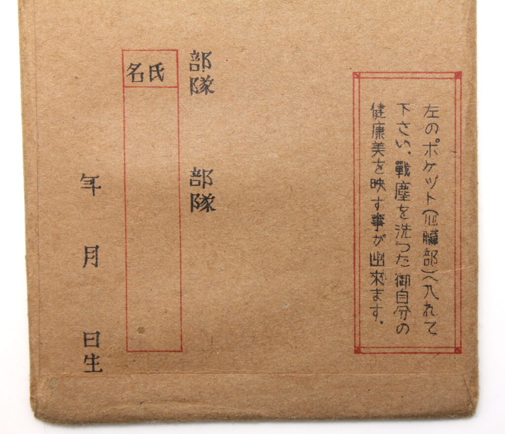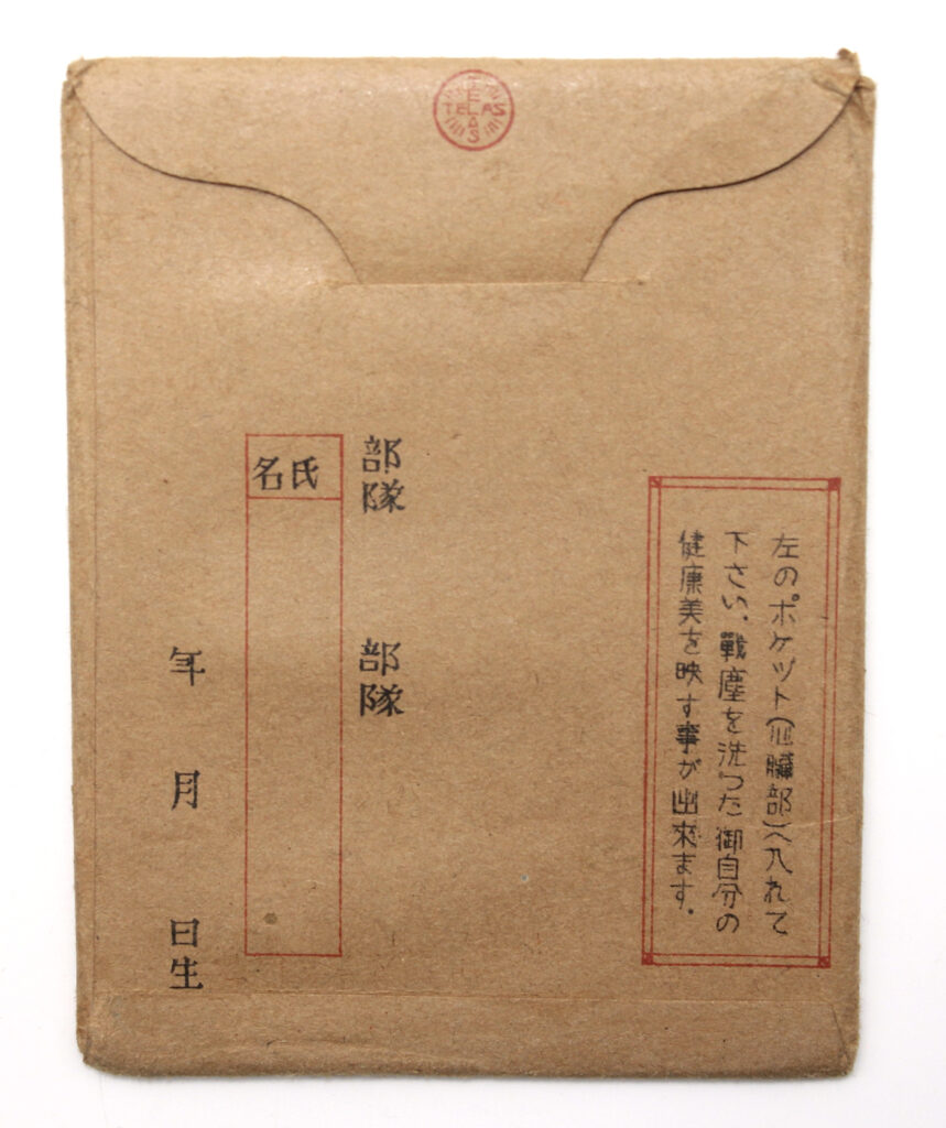 L’étui en papier contient une plaque en acier que le soldat japonais devait placer dans la poche avant gauche de sa vareuse afin de protéger son coeur d’une éventuelle balle tirée par l’ennemi.