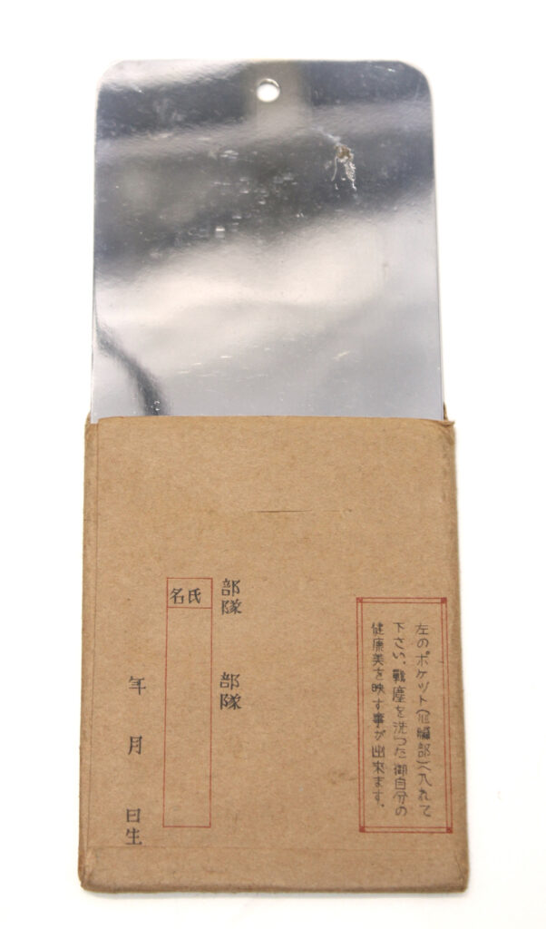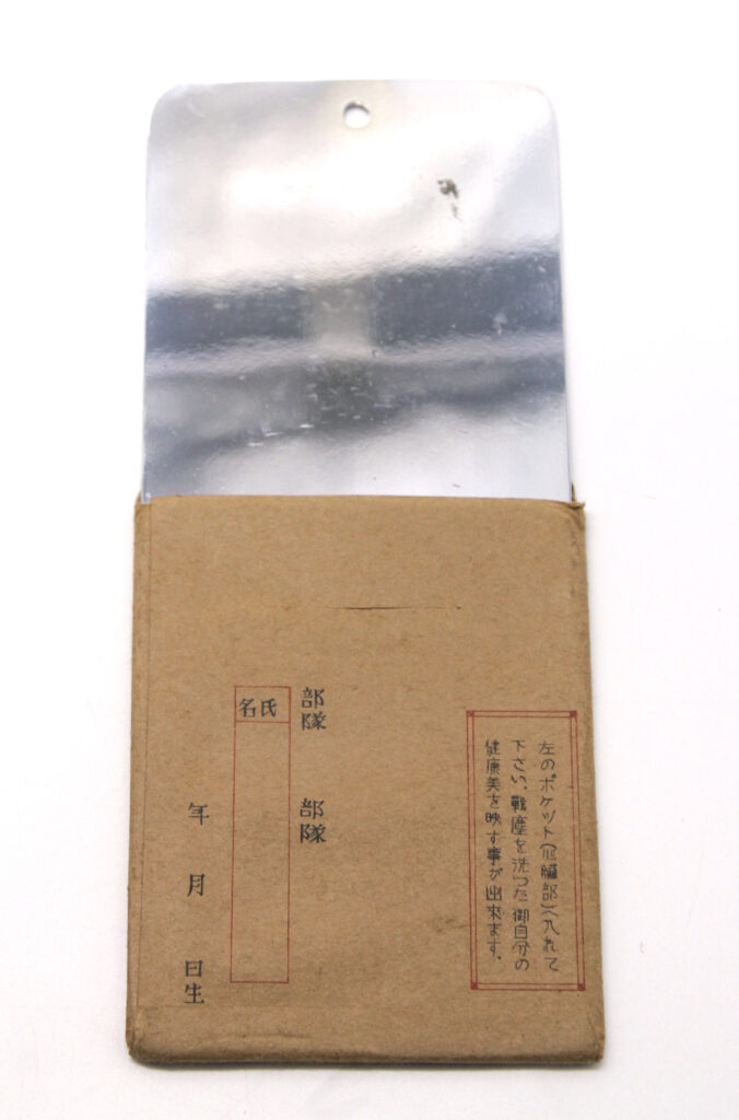 左のポッケト(心臓部)へいれてください。戦塵を洗った御自分の健康美を映す事ができます。(Veuillez le placer dans la poche (zone du coeur). Il reflétera votre beauté saine après avoir lavé la poussière de guerre.)