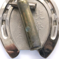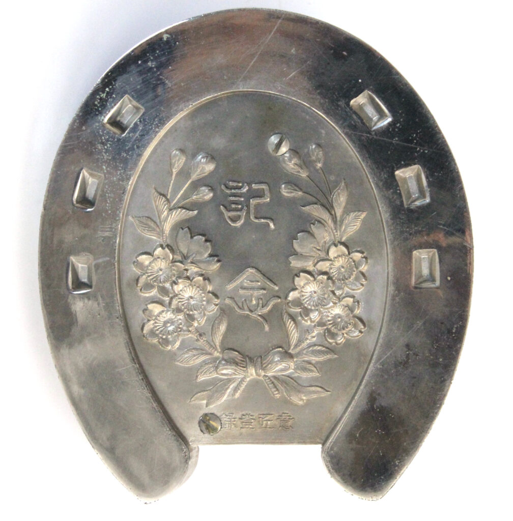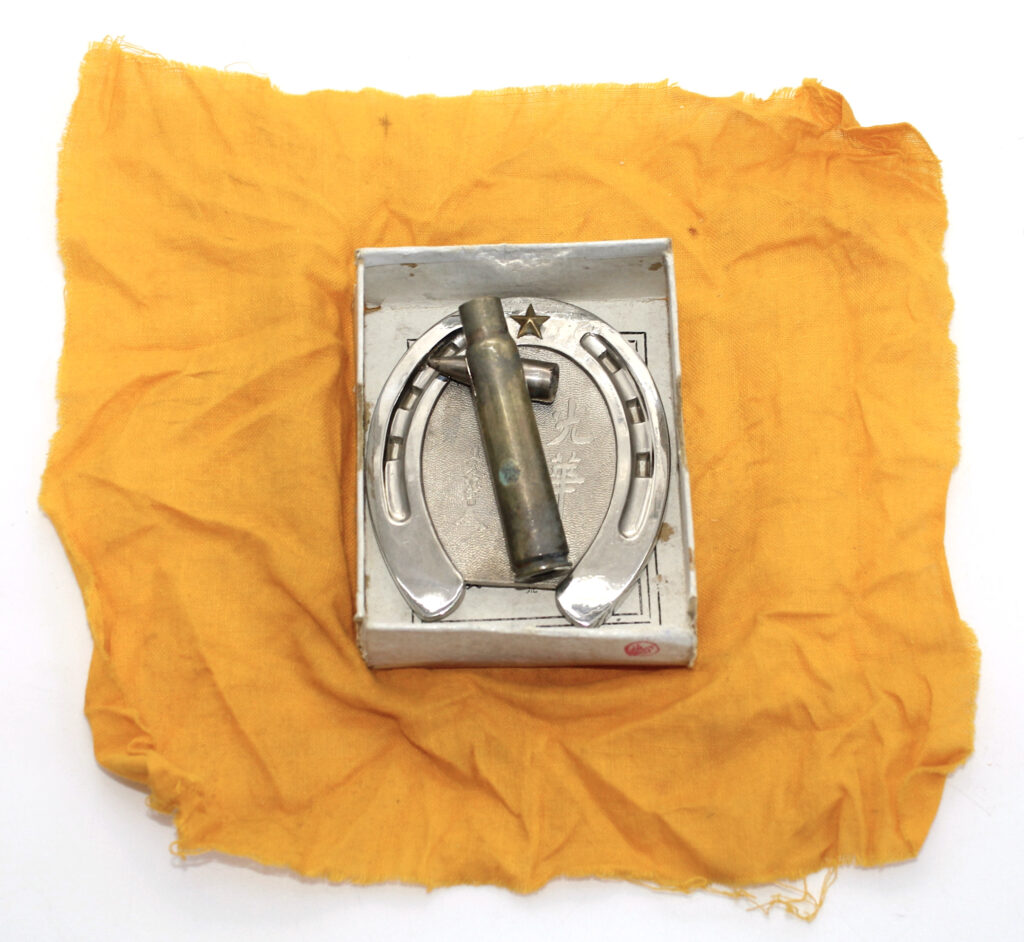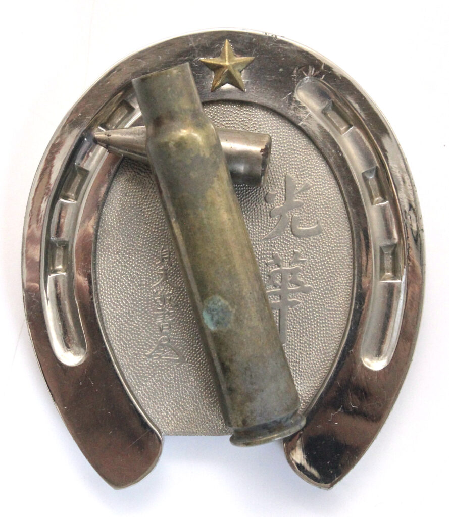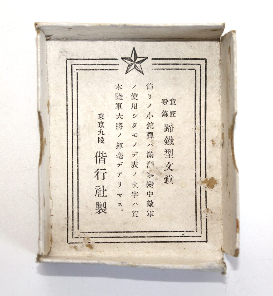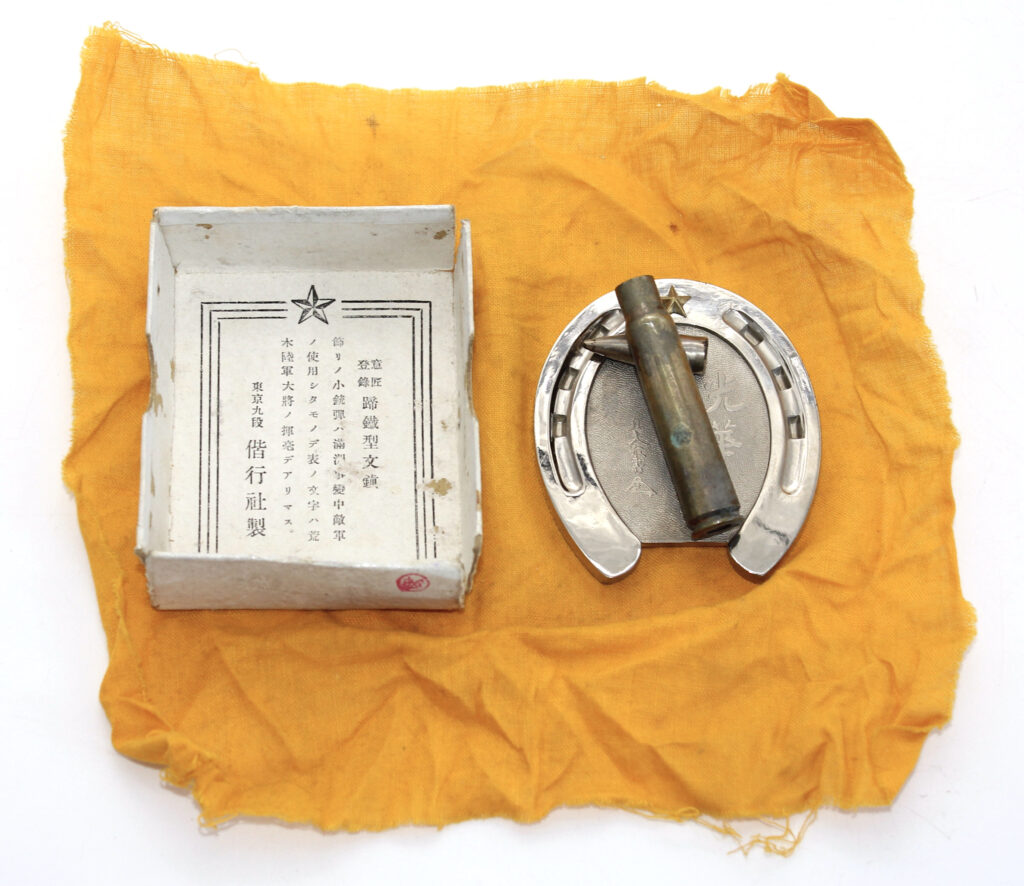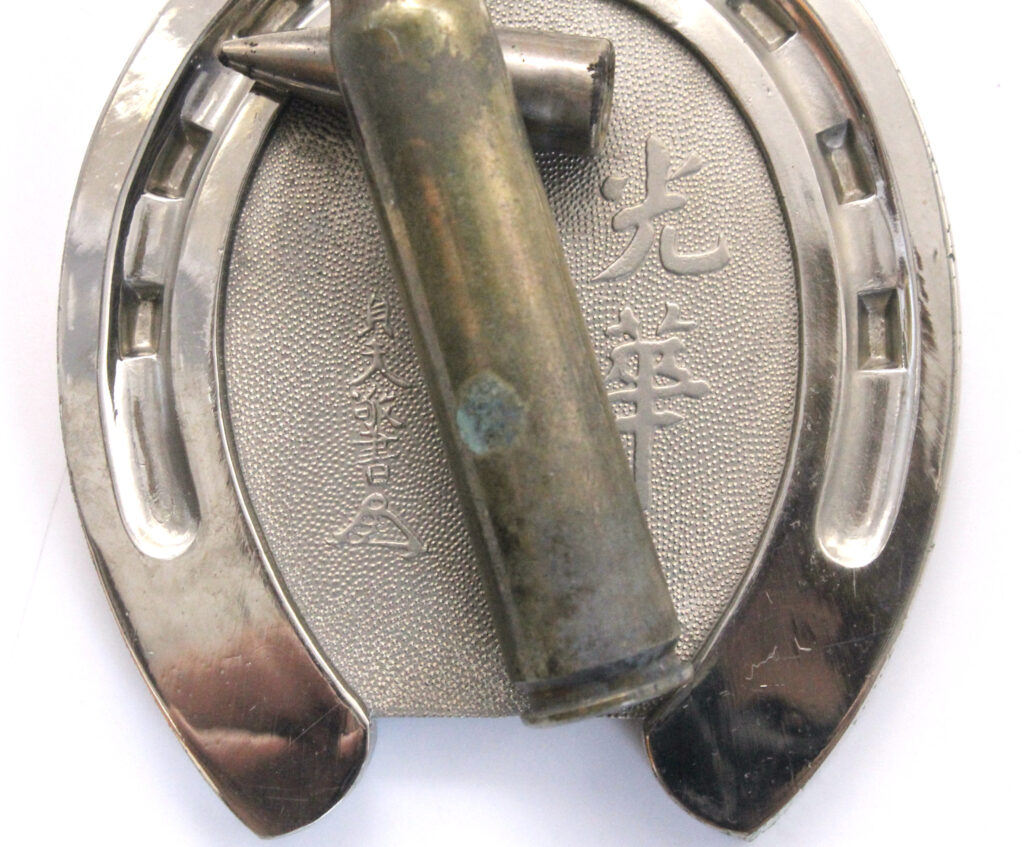 Ce presse-papiers en métal représente un fer à cheval orné de l’étoile de l’Armée impériale japonaise avec une cartouche de fusil placée dessus. Il commémore l’incident de Mandchourie.