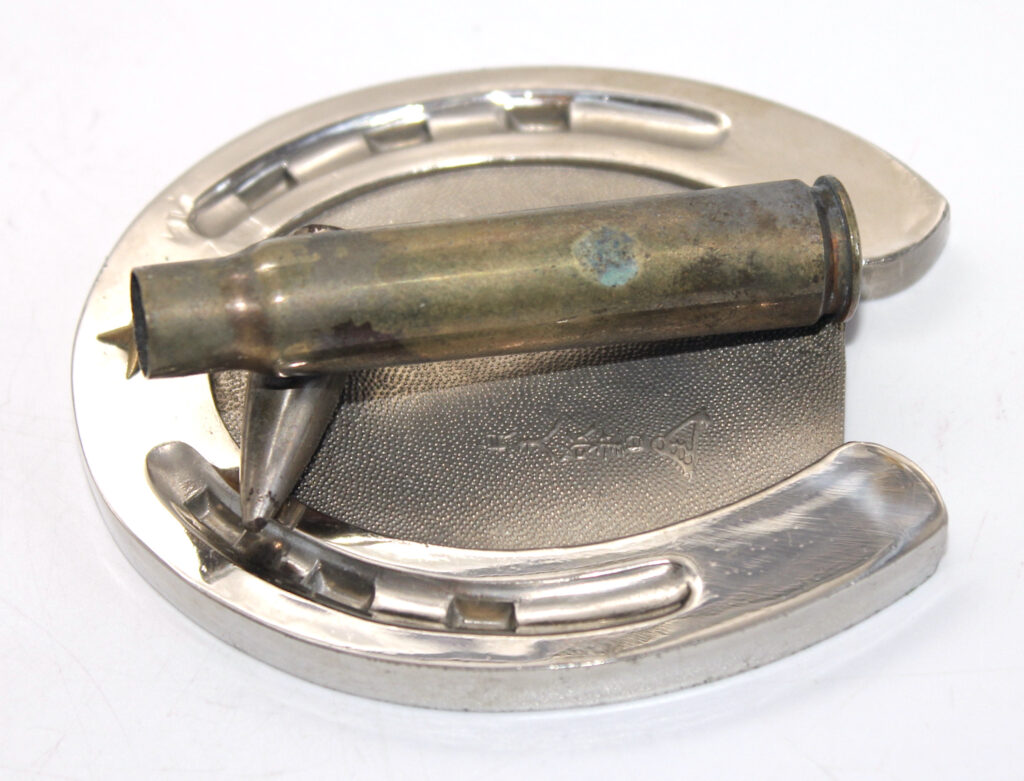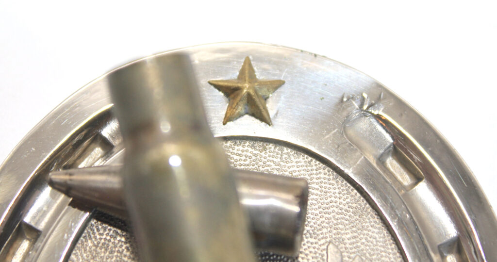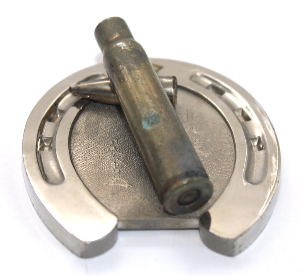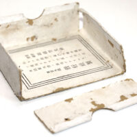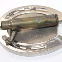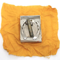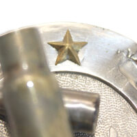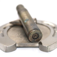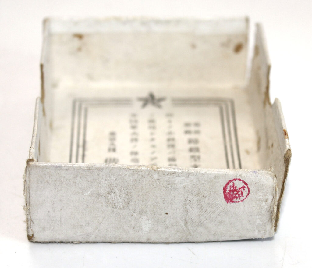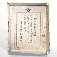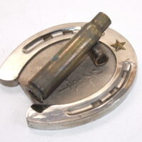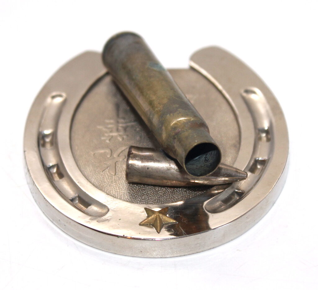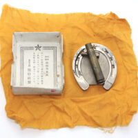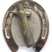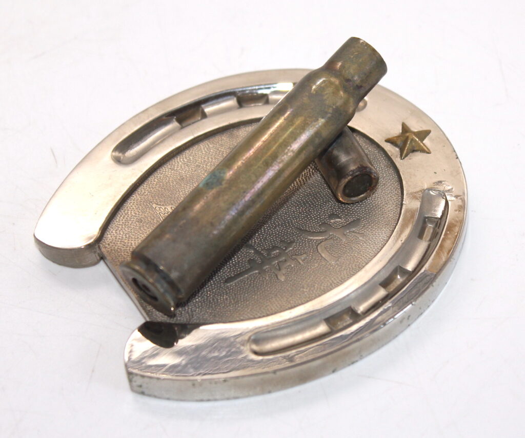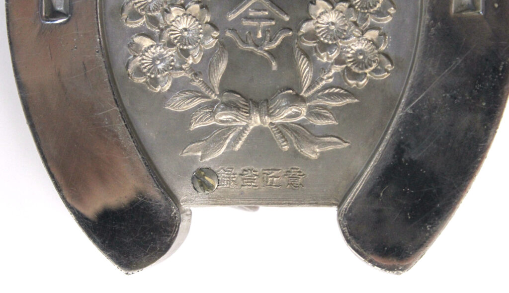 Ce presse-papiers en métal représente un fer à cheval orné de l’étoile de l’Armée impériale japonaise avec une cartouche de fusil placée dessus. Il commémore l’incident de Mandchourie.