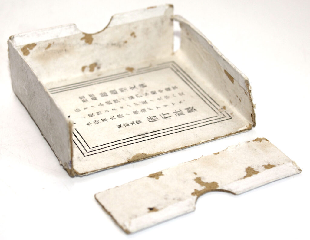 Le presse-papiers est avec une partie de sa boite en carton d’origine. Les inscriptions à l’intérieur indiquent :