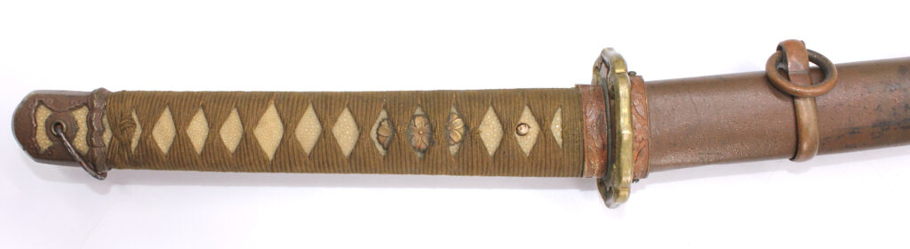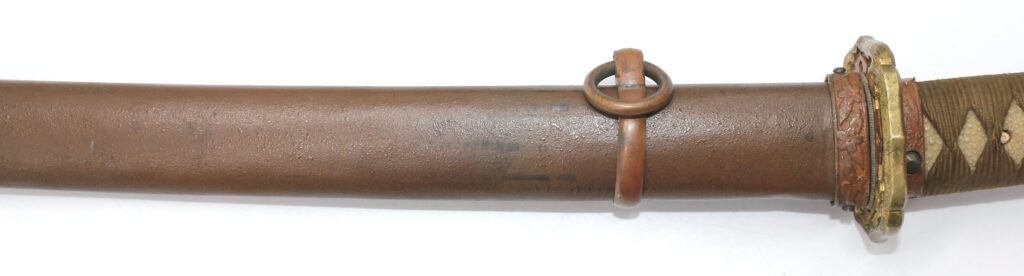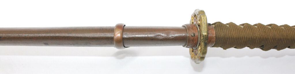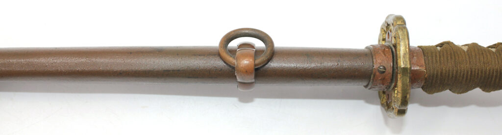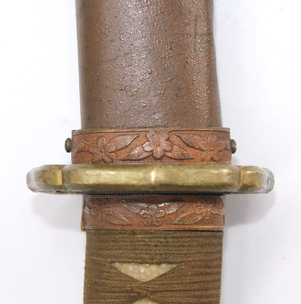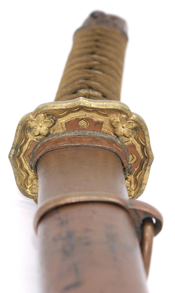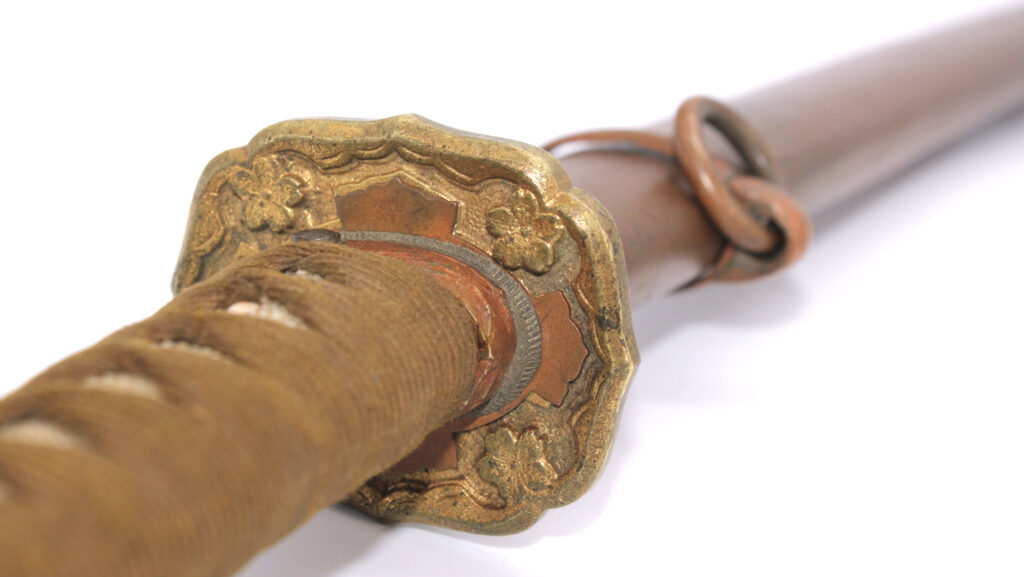 Les montures du sabre et du fourreau sont en bon état, la plupart sont ornées de fleurs de cerisier exceptée la pièce à l’extrémité de la Tsuka et celle à l’extrémité du Saya (fourreau). Le fait que ce sabre comporte ces montures simplifiées indique qu’il s’agit d’un sabre produit dans les dernières années de la Seconde Guerre mondiale. De ce fait, les fleurs de cerisier qui ornent les autres montures sont également moins détaillées qu’à l’habitude. L’attache de l’anneau sur le fourreau est également simplifiée.