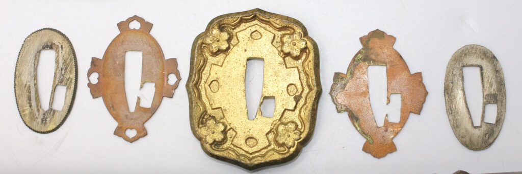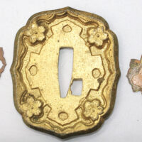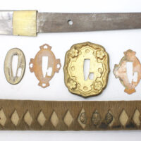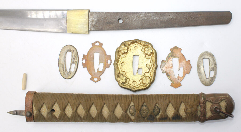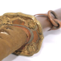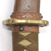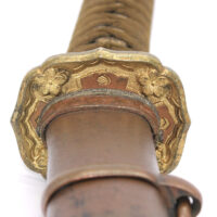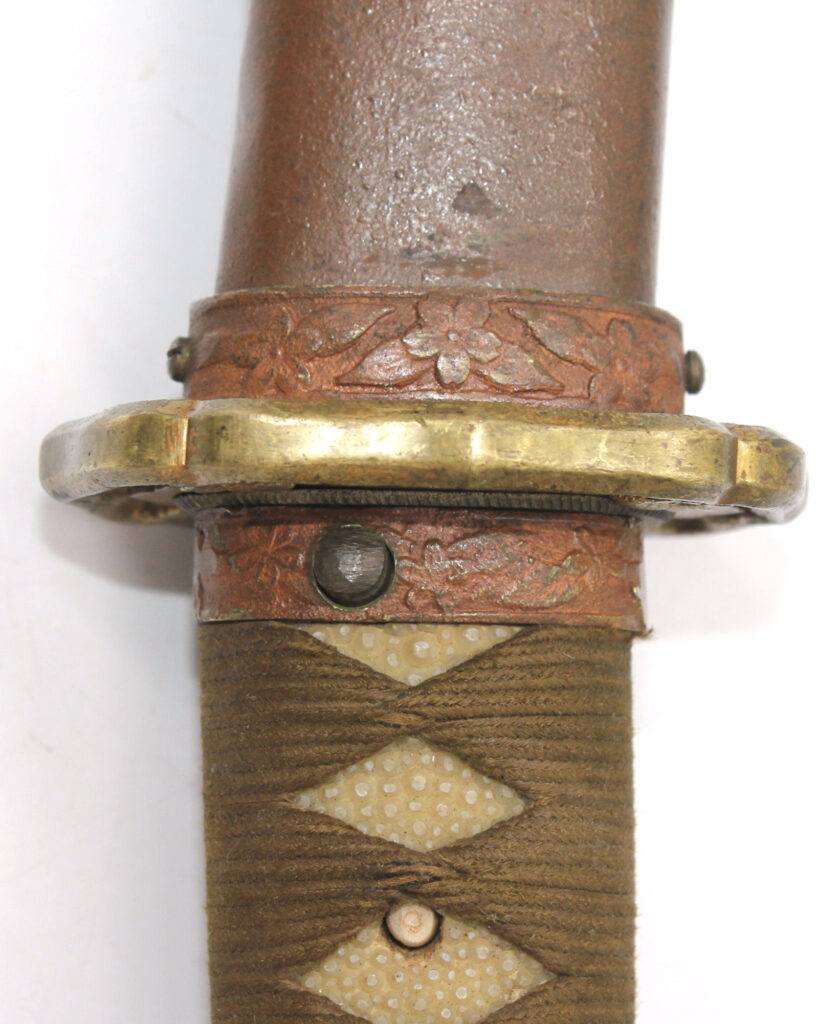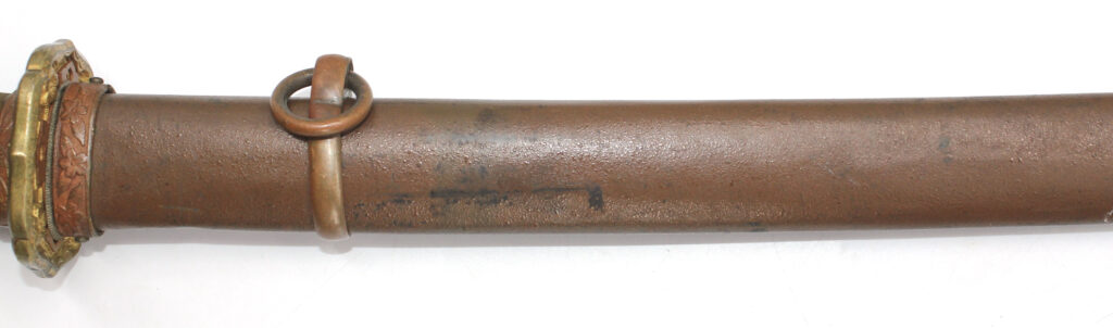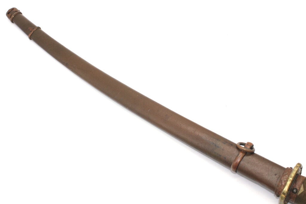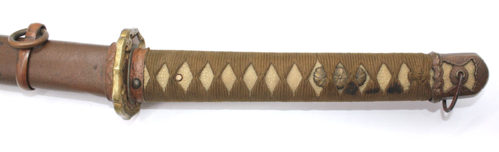 Les montures du sabre et du fourreau sont en bon état, la plupart sont ornées de fleurs de cerisier exceptée la pièce à l’extrémité de la Tsuka et celle à l’extrémité du Saya (fourreau). Le fait que ce sabre comporte ces montures simplifiées indique qu’il s’agit d’un sabre produit dans les dernières années de la Seconde Guerre mondiale. De ce fait, les fleurs de cerisier qui ornent les autres montures sont également moins détaillées qu’à l’habitude. L’attache de l’anneau sur le fourreau est également simplifiée.