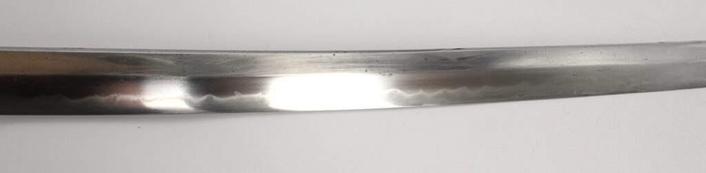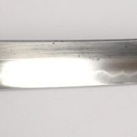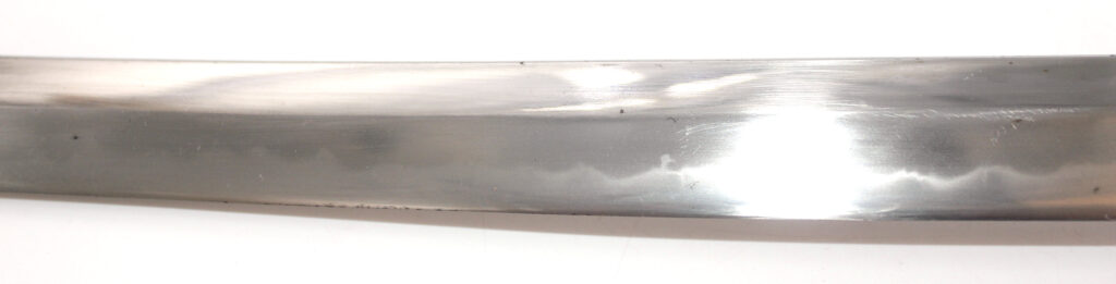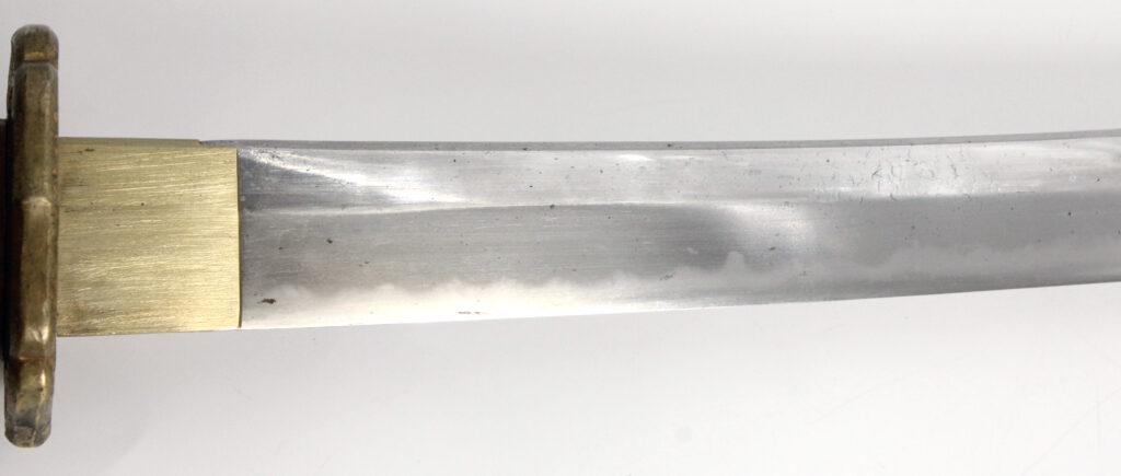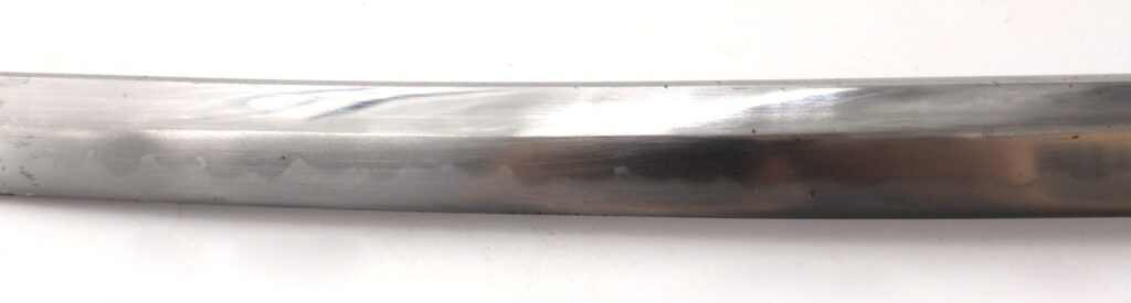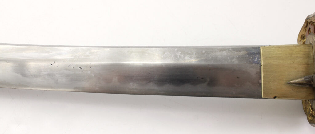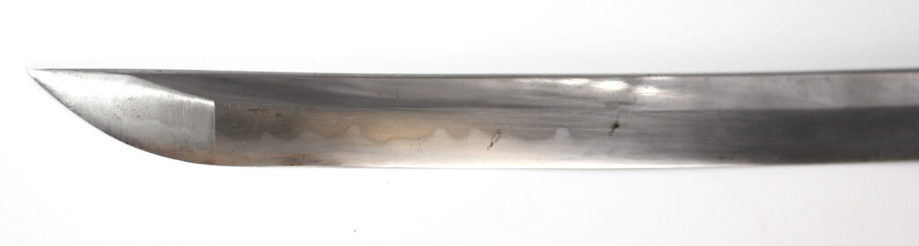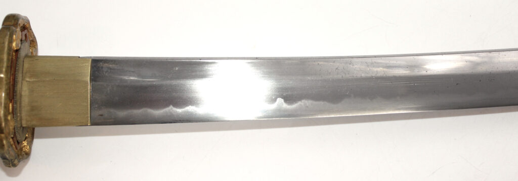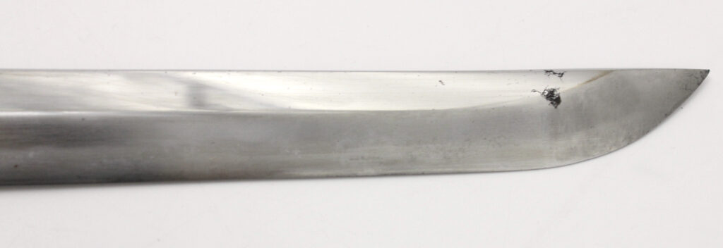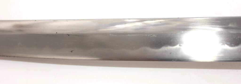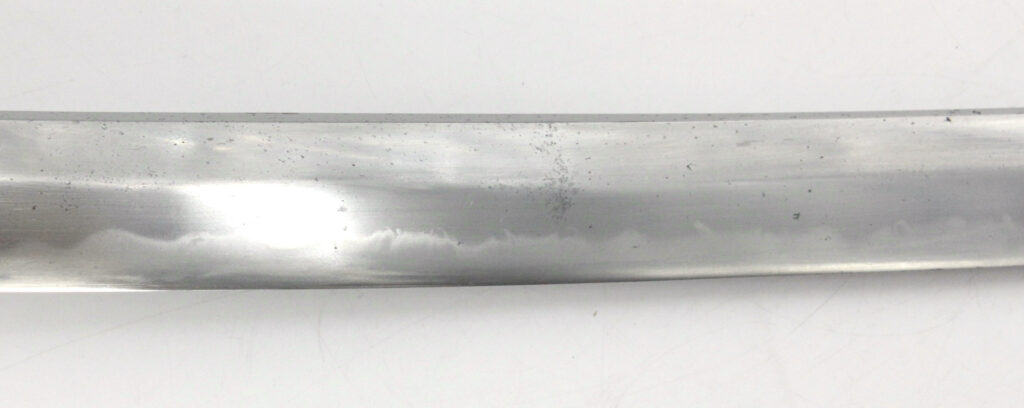 La lame forgée (Showato) est en bon état malgré quelques traces d’oxydation et des micro rayures. La lame présente une ligne de trempe de type midare.