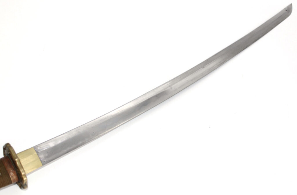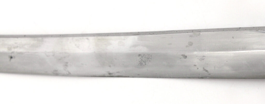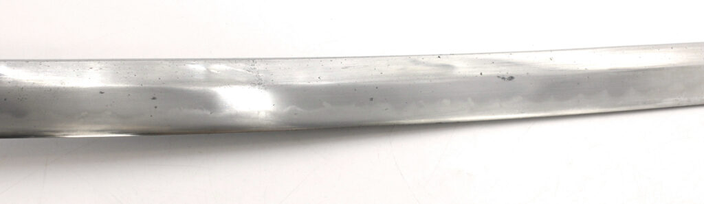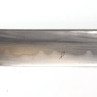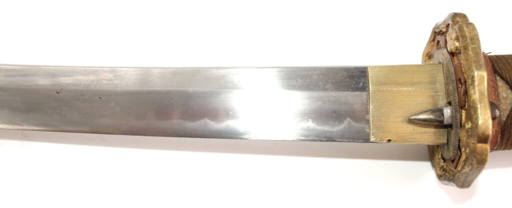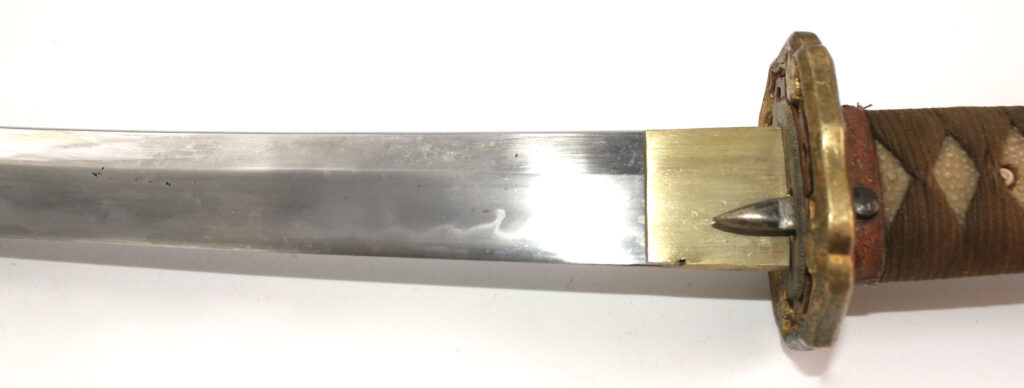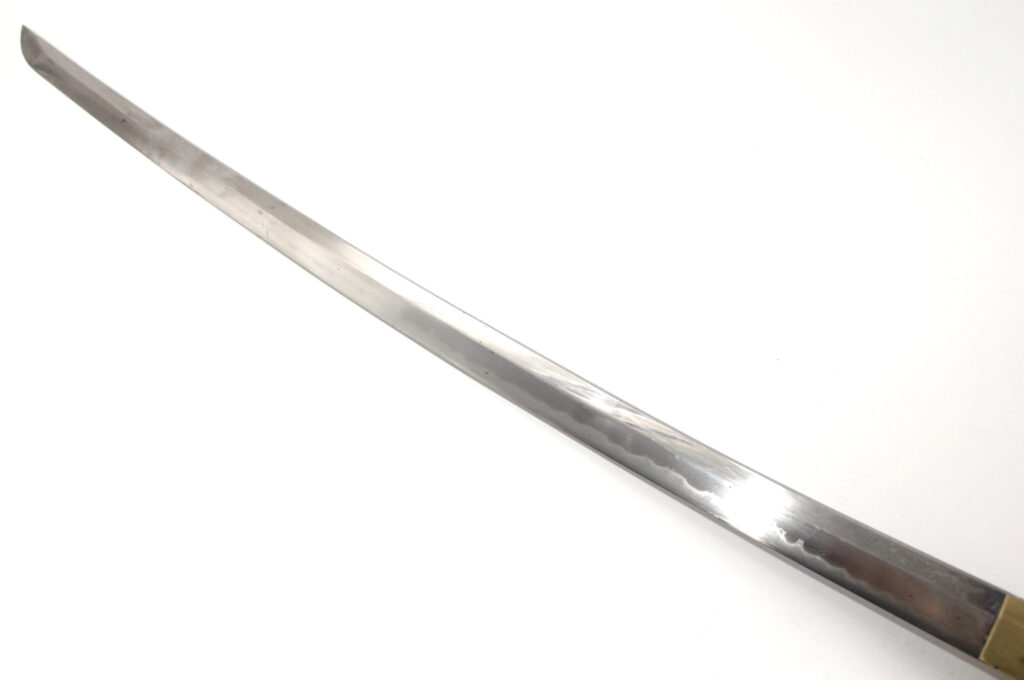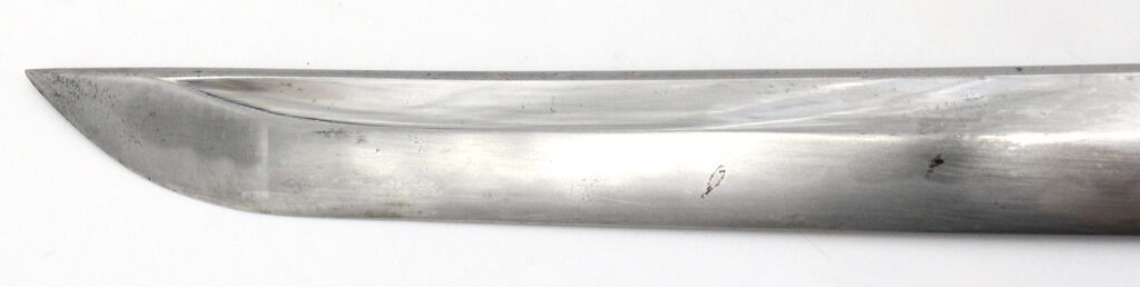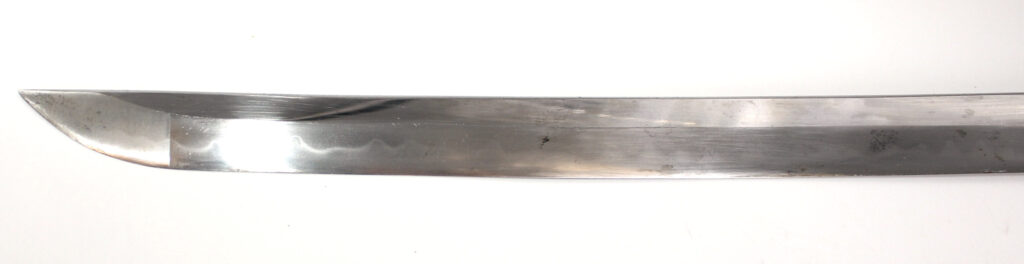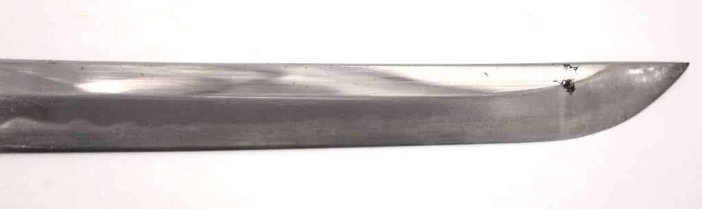 La lame forgée (Showato) est en bon état malgré quelques traces d’oxydation et des micro rayures. La lame présente une ligne de trempe de type midare.
