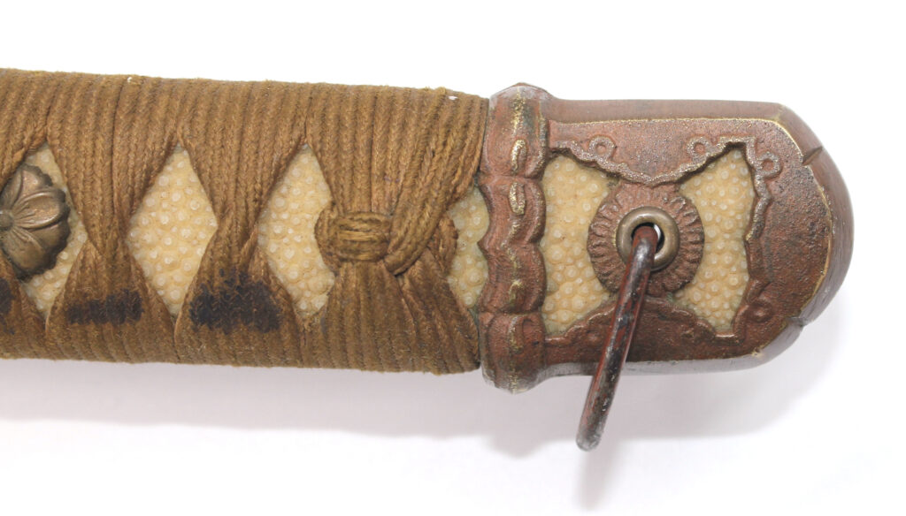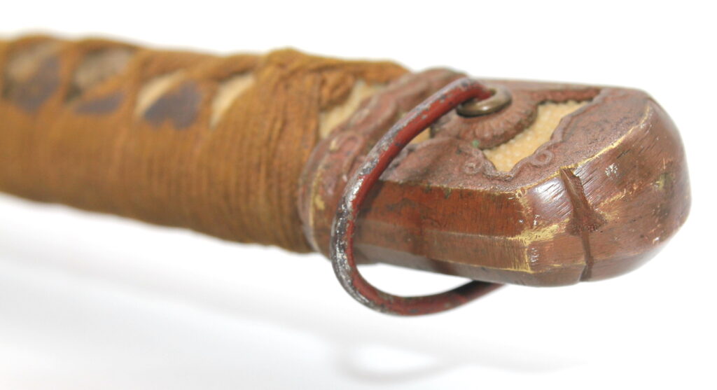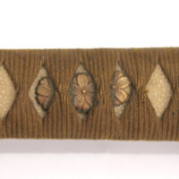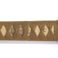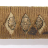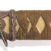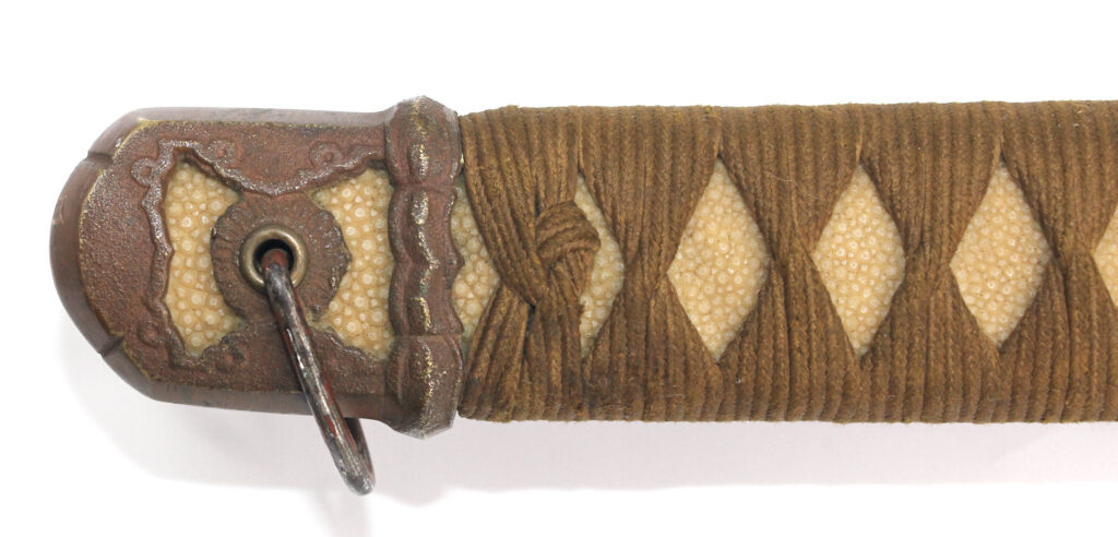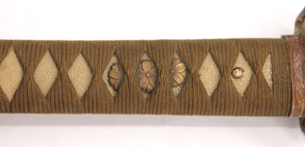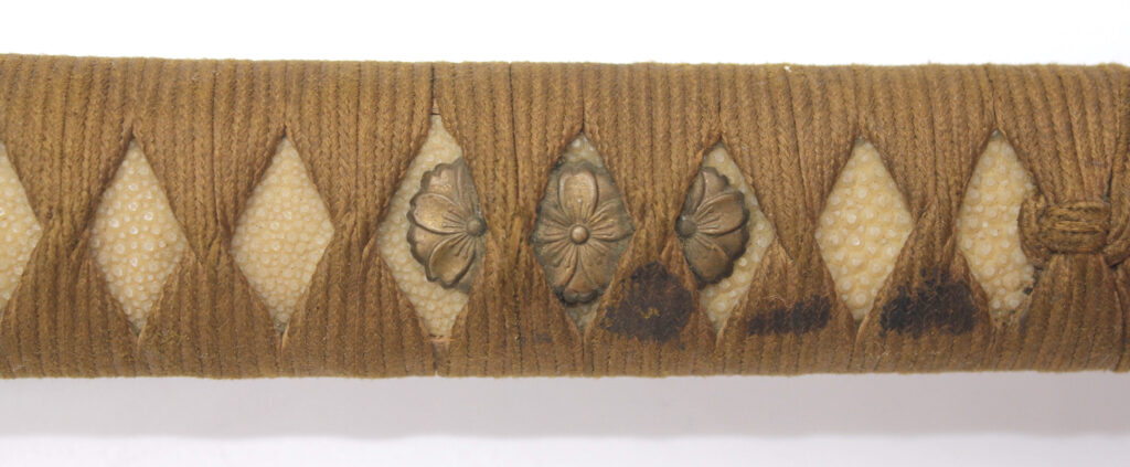 La Tsuka (poignée) est recouverte de peau de raie qui est elle même recouverte par un tressage de soie marron.