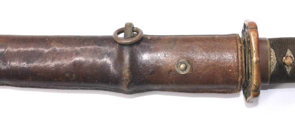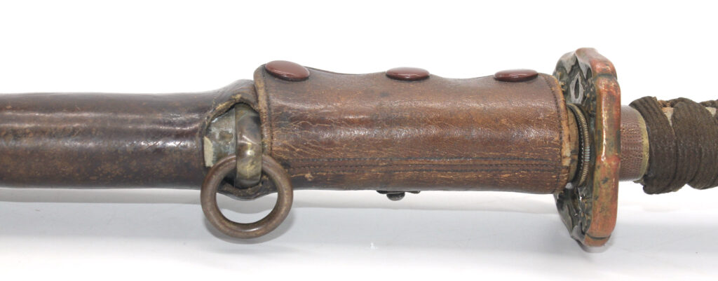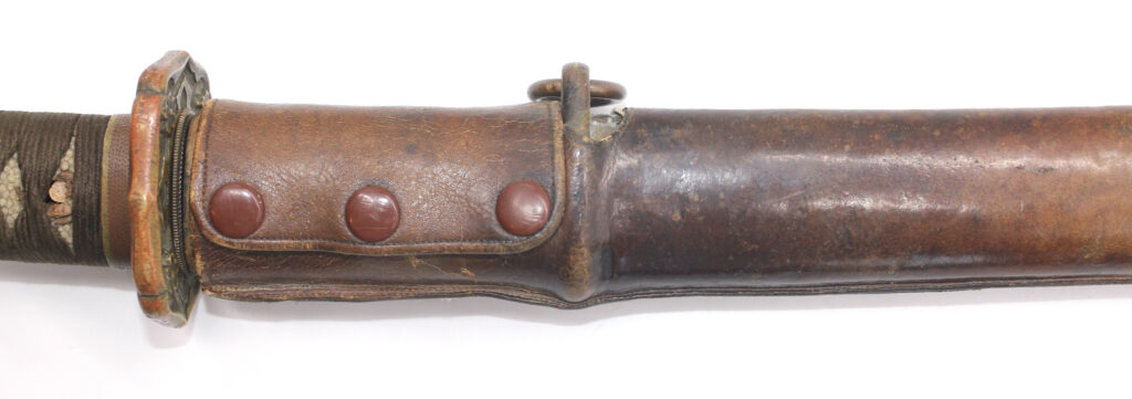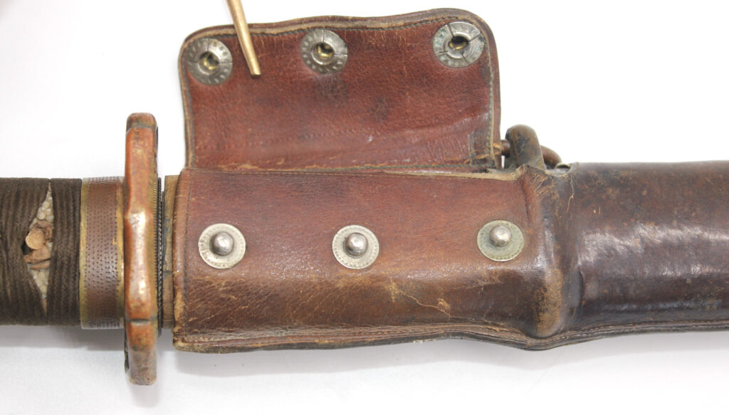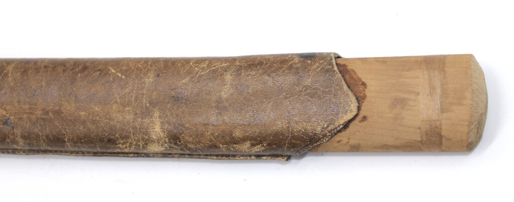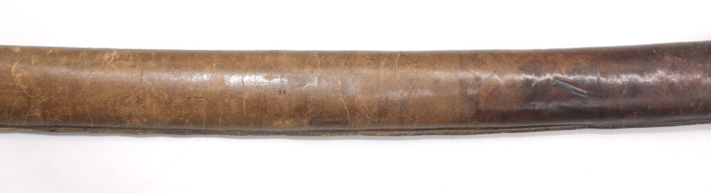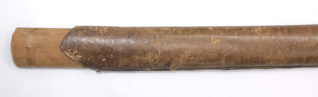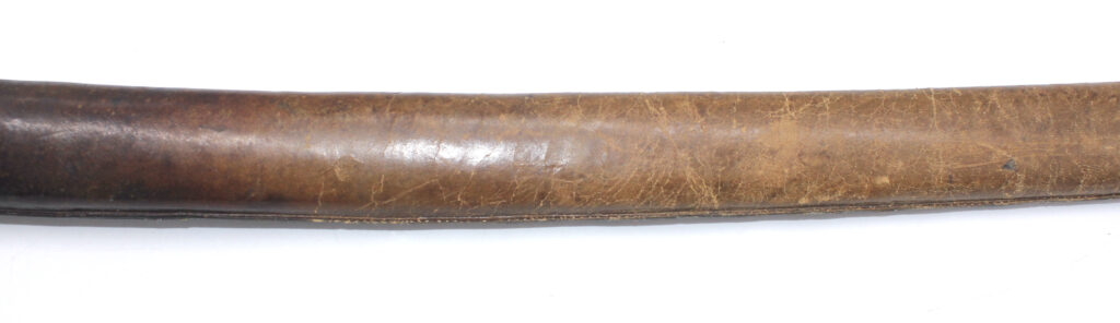 Le fourreau du sabre est en bois recouvert d’une gaine de protection en cuir. Il était généralement utilisé en remplacement afin d’éviter que le fourreau en acier ne soit abimé, mais également pour que la végétation ne vienne pas frapper contre le métal.