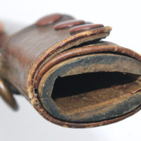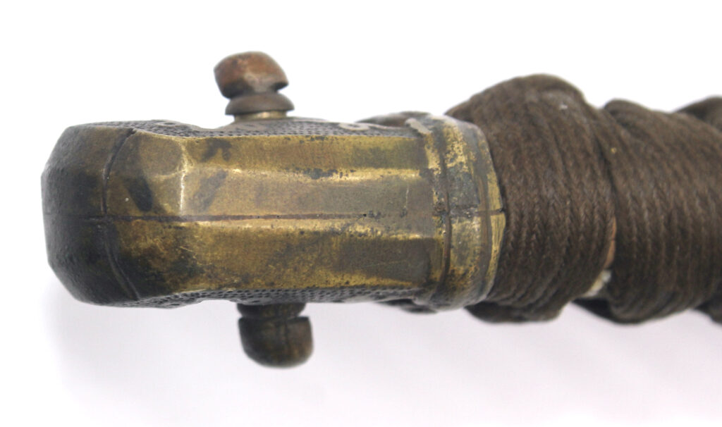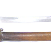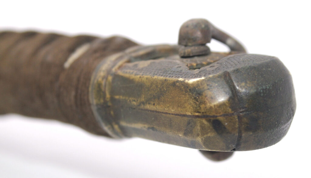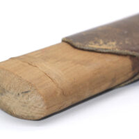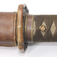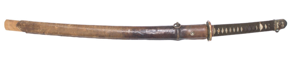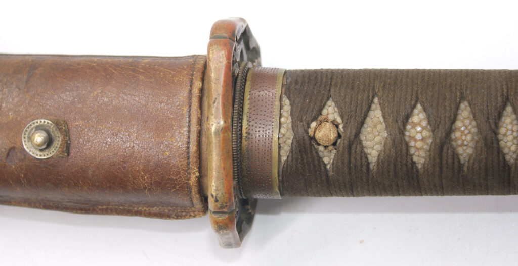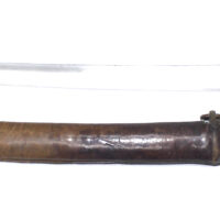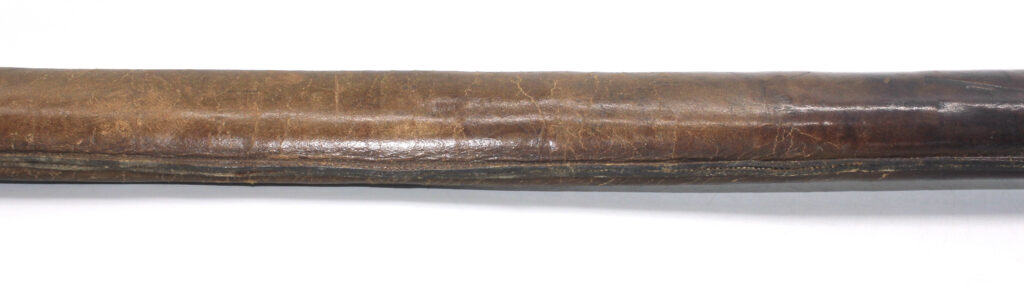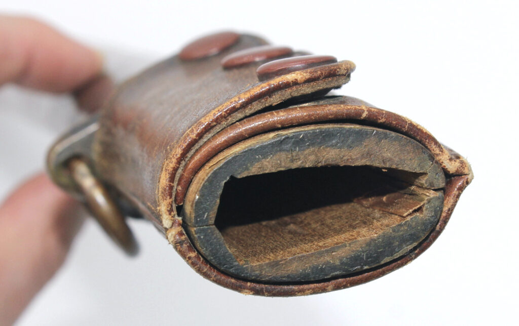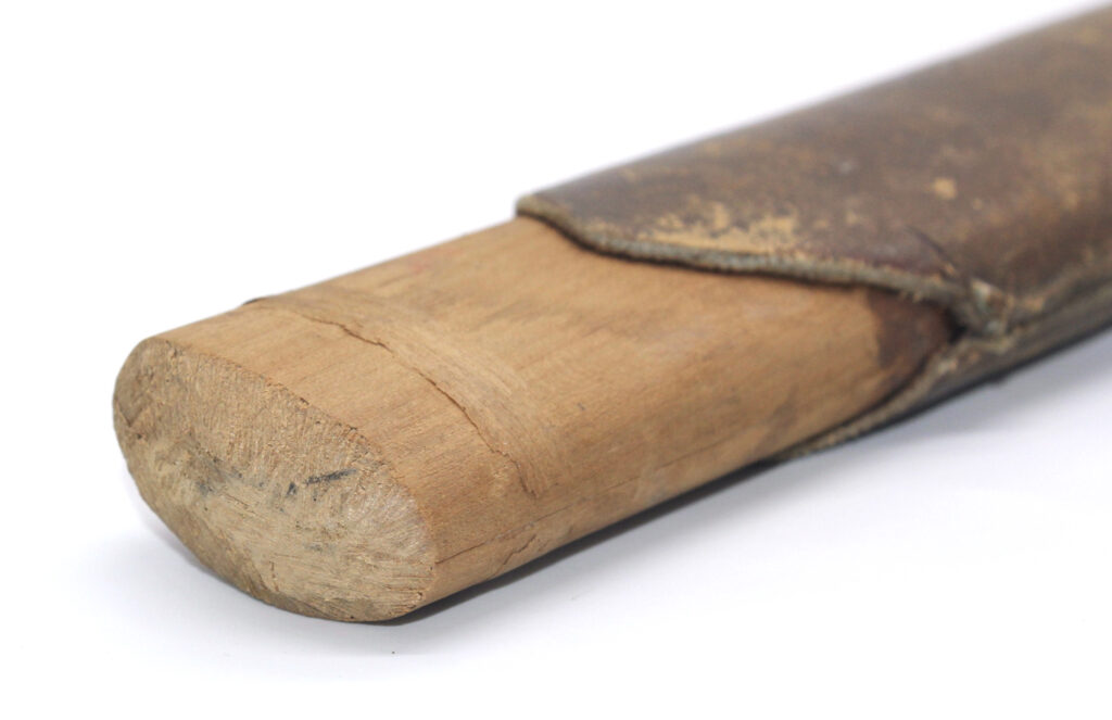 Le fourreau du sabre est en bois recouvert d’une gaine de protection en cuir. Il était généralement utilisé en remplacement afin d’éviter que le fourreau en acier ne soit abimé, mais également pour que la végétation ne vienne pas frapper contre le métal.