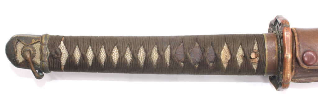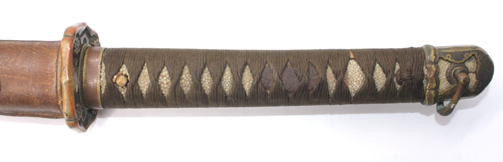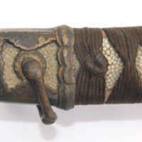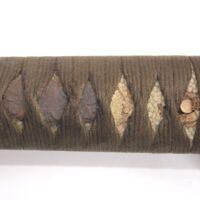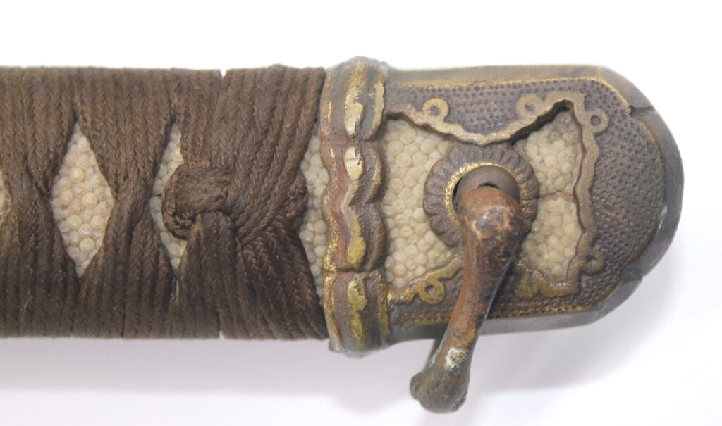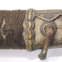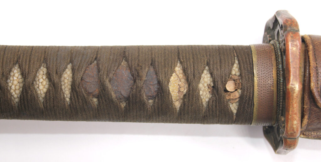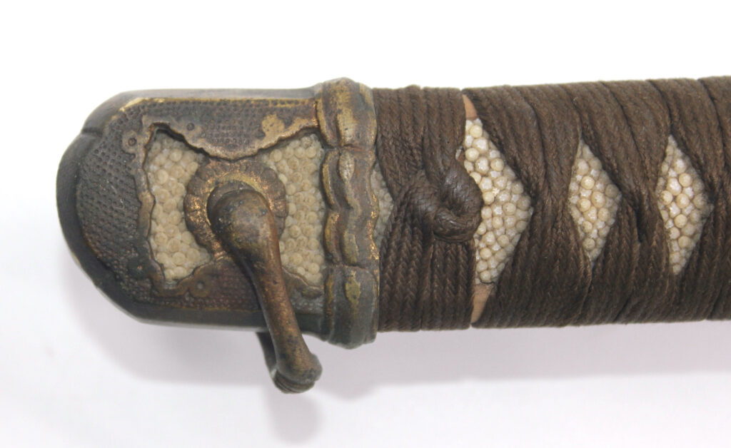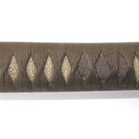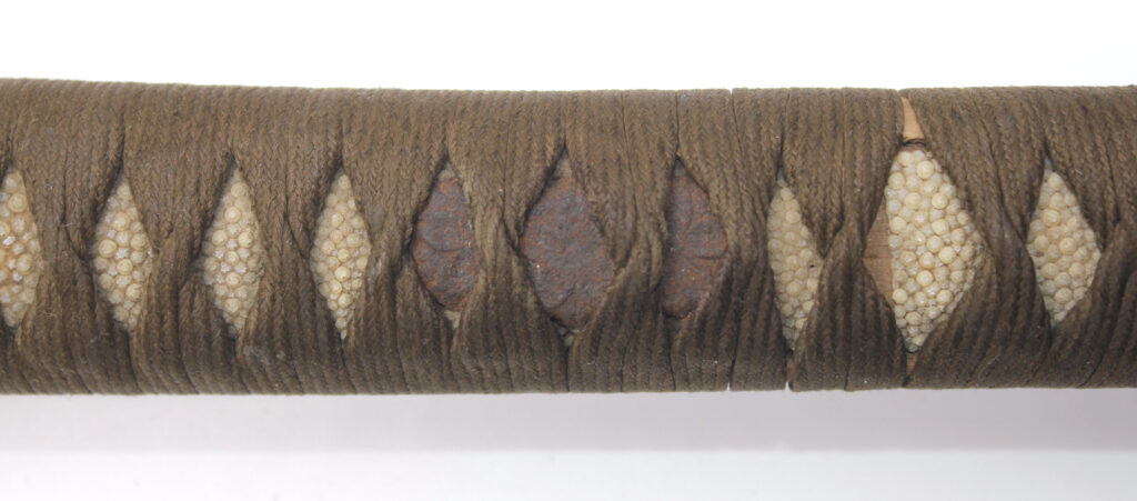 La Tsuka (poignée) est recouverte de peau de raie qui est elle même recouverte par un tressage de soie marron.