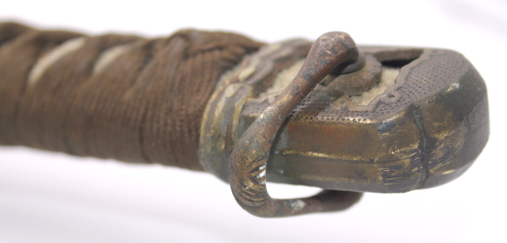 La languette en cuir censée être présente sur la poignée du sabre pour permettre de le maintenir accroché au fourreau est manquante.