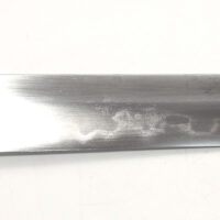 La lame est forgée traditionnellement, elle est en bon état malgré quelques traces d’oxydation et des micro rayures. La lame présente une ligne de trempe de type Choji.