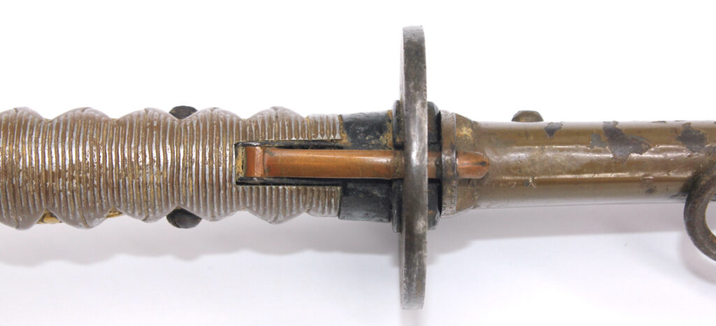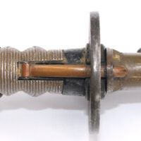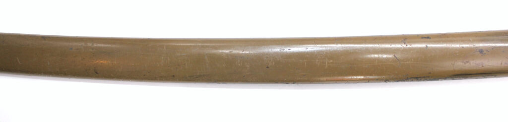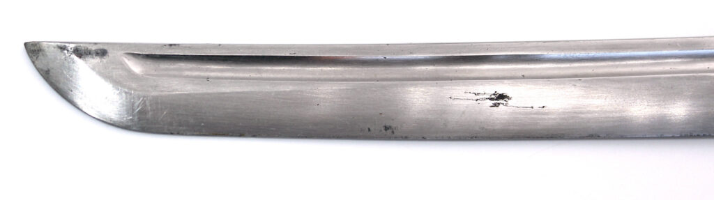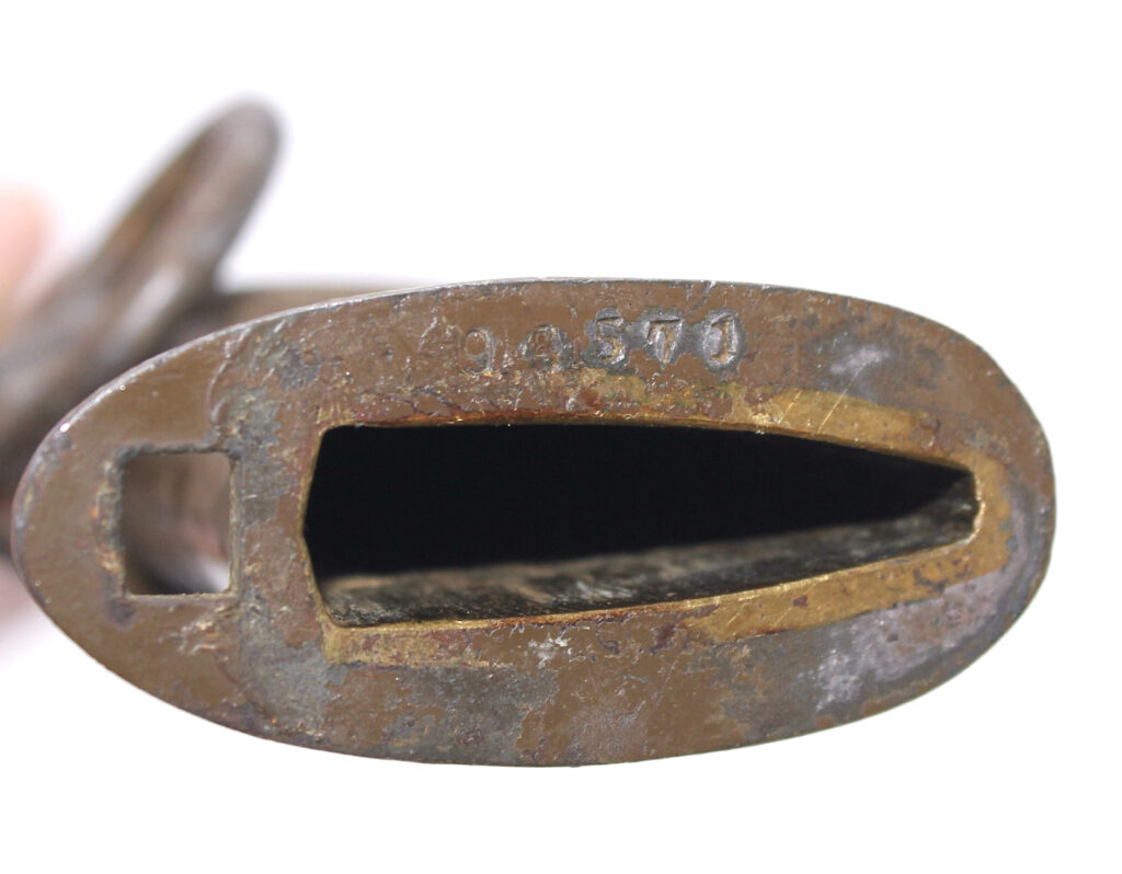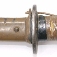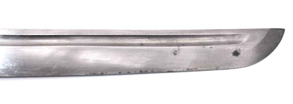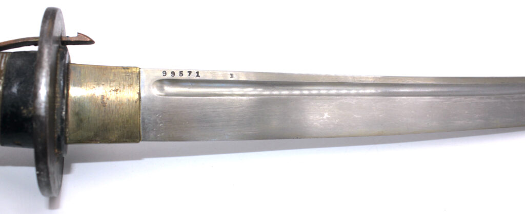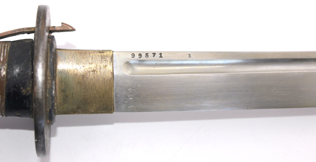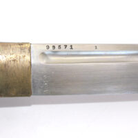 Le numéro de série présent sur la lame (99571) est suivi du poinçon d’inspection. Le même numéro de série est présent sur le fourreau en acier.