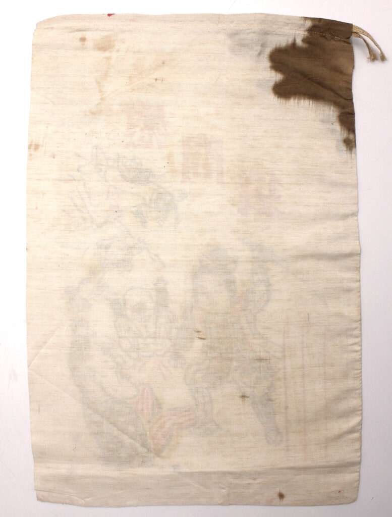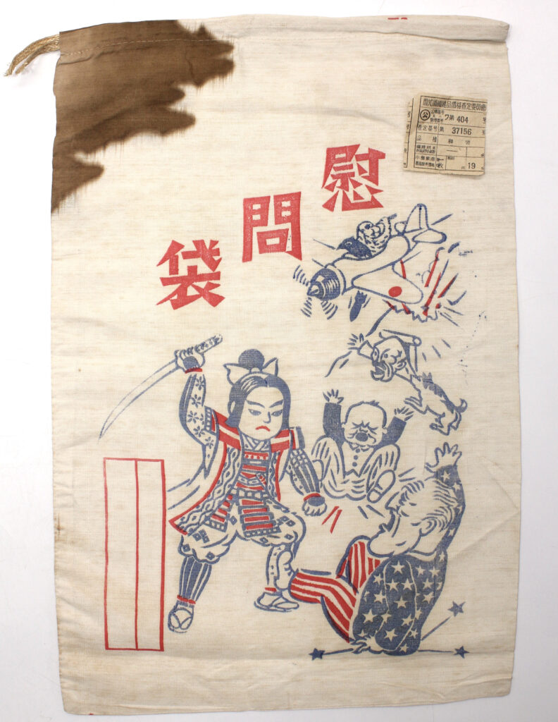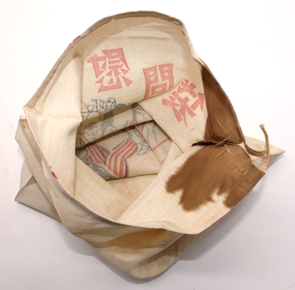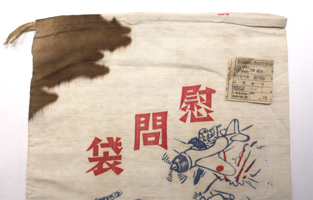 Ces sacs étaient fabriqués/achetés par des associations civiles ou par les proches des soldats japonais pour leur envoyer divers objets de réconfort qui n’étaient pas distribués par l’armée (nourriture, cigarettes, amulettes, lettres…).