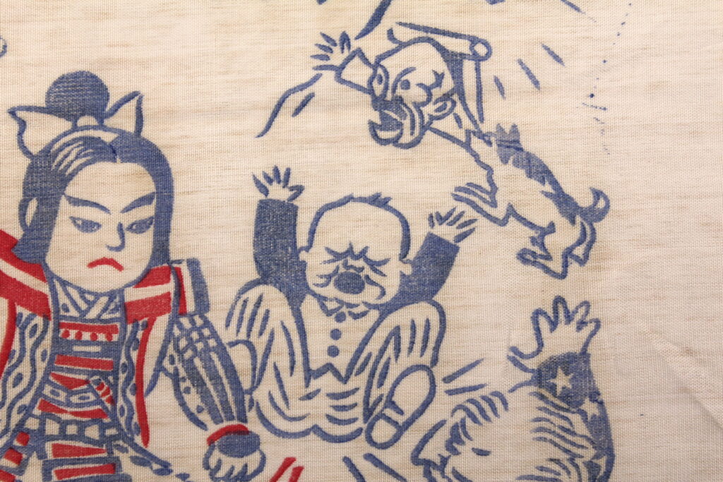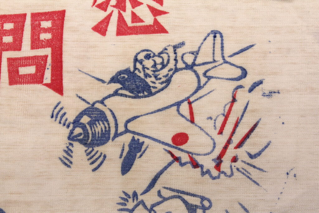 Dans l’histoire, Momoratō se lie d’amitié avec un chien, un singe et un faisan. Sur la représentation du sac, le chien s’attaque à Chiang Kaishek quant au singe et au faisan, ils sont dans un avion Mitsubishi A6M.